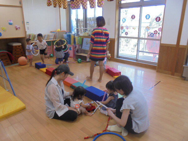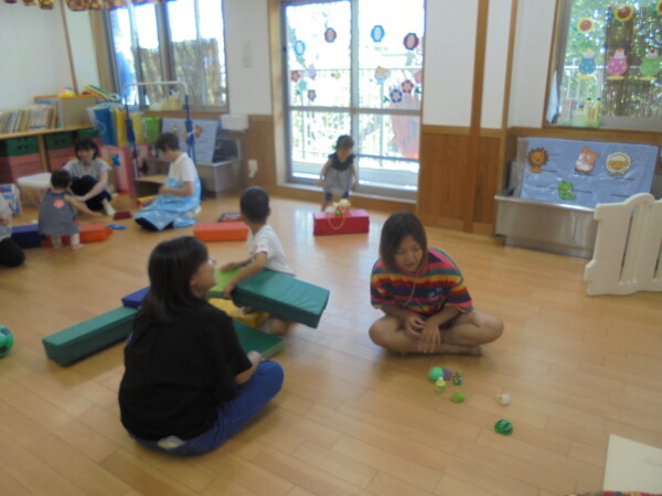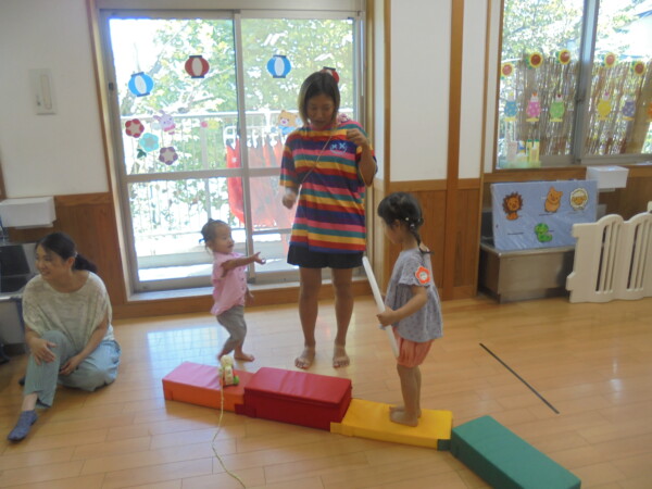 8月も残すところ数日になってしまいました。猛暑に始まり、猛暑で終わろうとしています。今日は水遊びで遊びたいと思っていましたが、アラートが発令されお部屋遊びに変更になりました。多目的ホールには、提燈があったり風鈴があったり夏祭り一色になっています。地域の夏祭りも楽しみですね。体調を崩すお友だちが多くなっています。皆さん気を付けて下さいね。