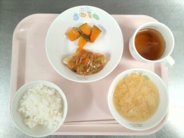 ご飯、味噌汁、魚の南野菜あんかけ、かぼちゃの甘煮・・・349kcal