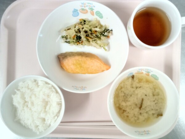 ごはん、味噌汁、鮭のカレームニエル、青菜のごま和え・・・346kcal