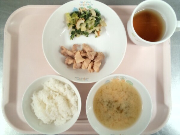 ごはん、味噌汁、鶏肉のさっぱり煮、ちくわフレンチ・・・334kcal