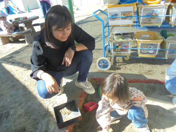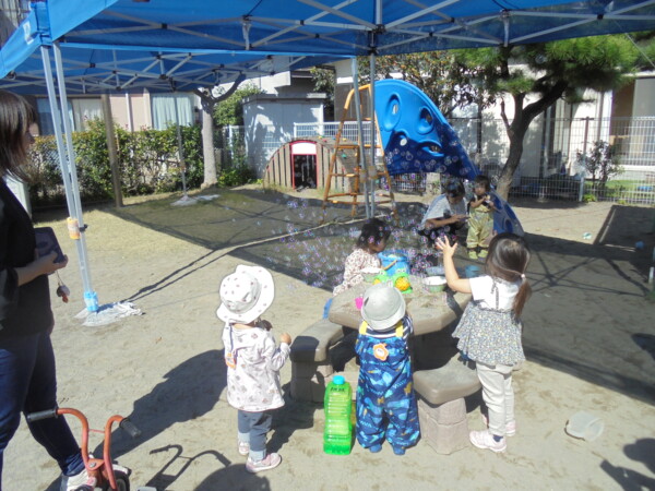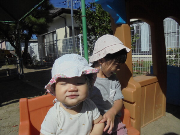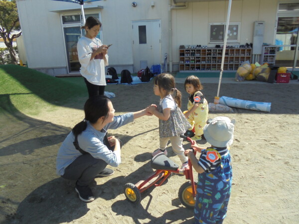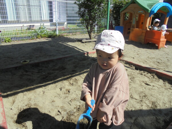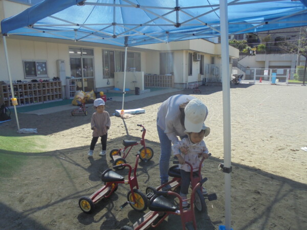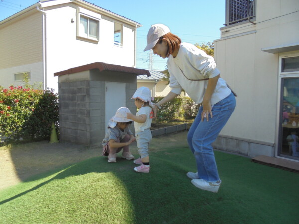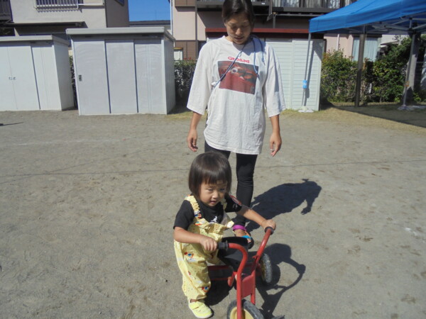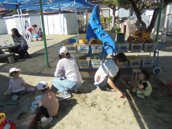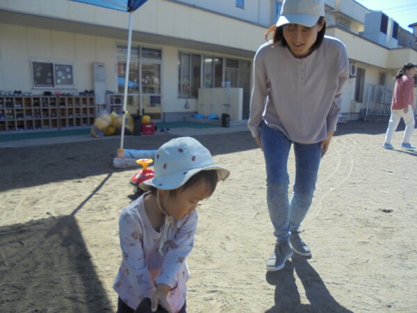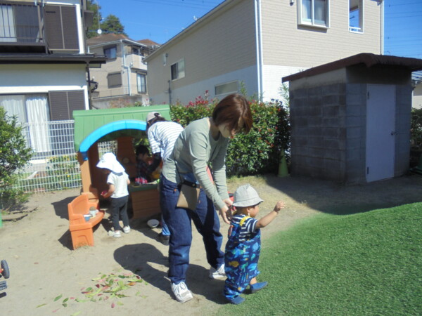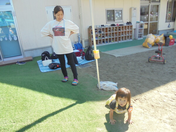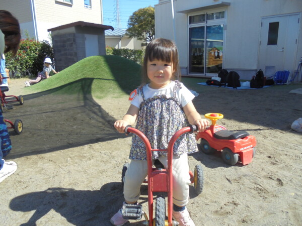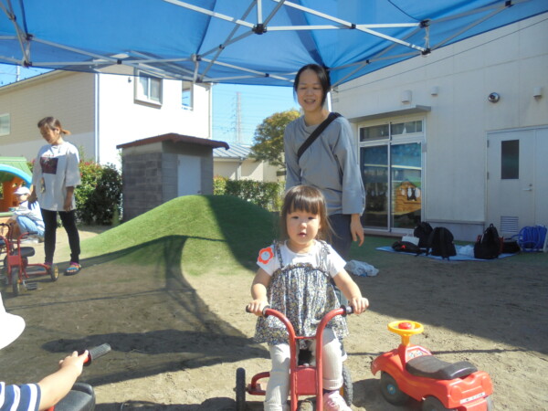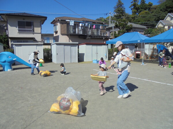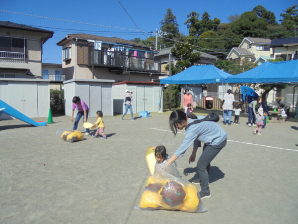 秋本番。過ごしやすい気候になり外遊びは絶好調です!三輪車がとても上手になり、ペダルをこぐ姿が、とてもかっこよくびっくりしました。子どもたちは、どんどん成長してお兄さん、お姉さん、可愛い子ちゃんから卒業して、ちょっと寂しいですね。今月は保育園での運動会の体験をしています。今日はたこ焼き競争です。ママとたこ焼きを運んで、落とさないでね。よーいドンはみんな大好きです。次は玉入れにしようかな?楽しい時間を作りましょう。また遊びに来てね。