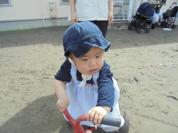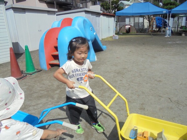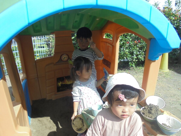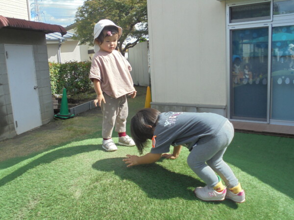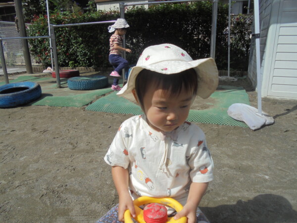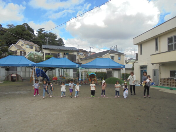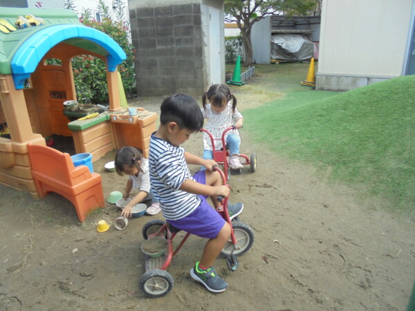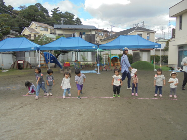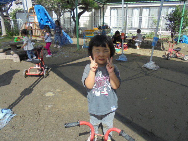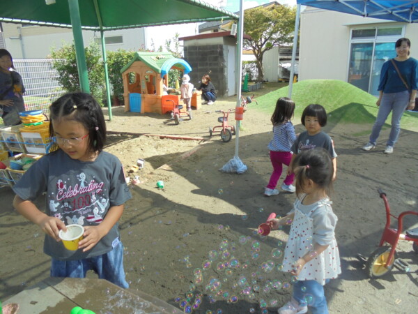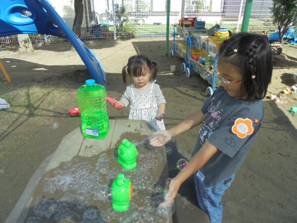 昨日の雨や涼しさがうそのように秋晴れの天気です。園庭には、大きな水たまりが・・・みんなが泥んこになってしまうかと心配でしたが無事回避しました。今日の一番人気は、ぞうさんかな。順番を守って上手に滑っていました。テーブルの上ではカエルさんが泡ブクブクになってシャボン玉を作っていました。みんながどんどんシャボン玉の液を入れるので頑張っていたのでしょう♡シャボン玉遊び、三輪車、思い思いの遊びを楽しみ、さいごにはみんなでよーいどん!かけっこをしました。
