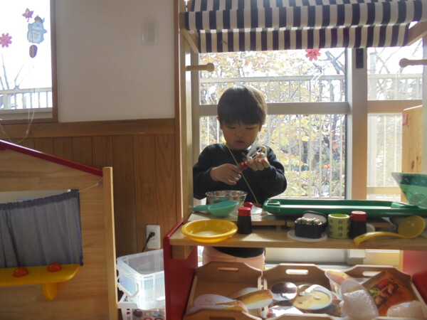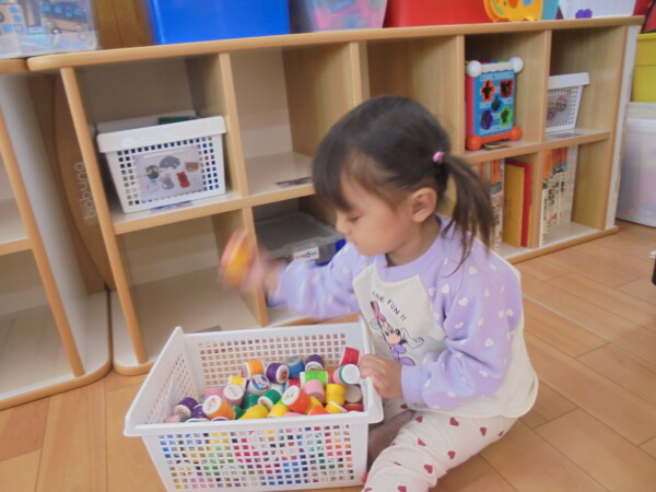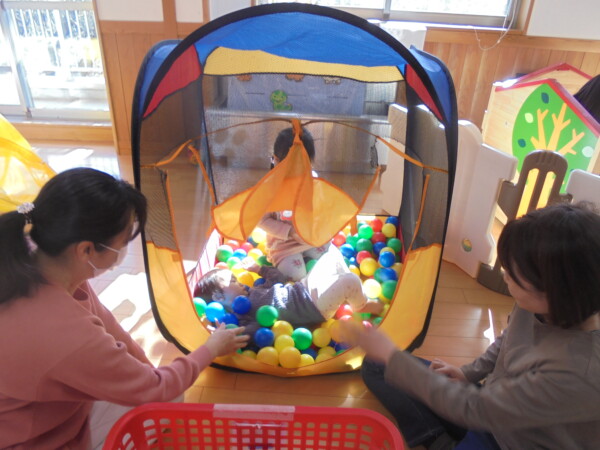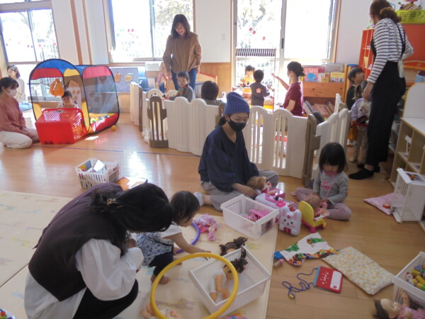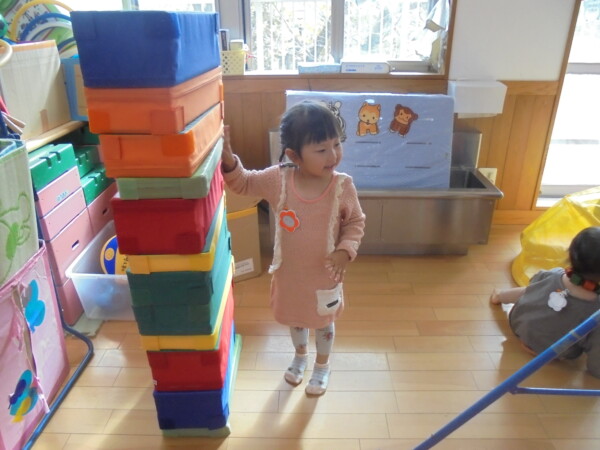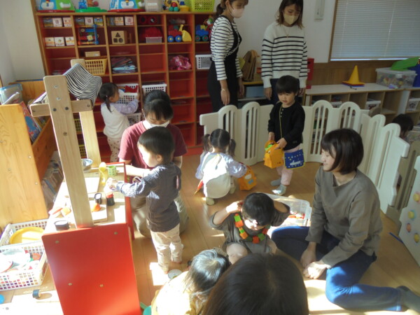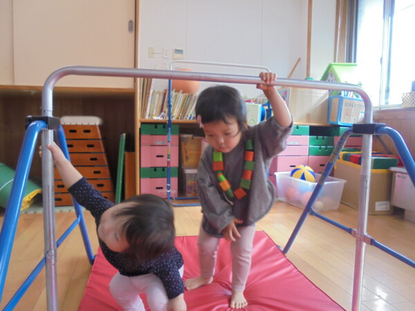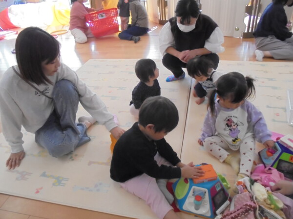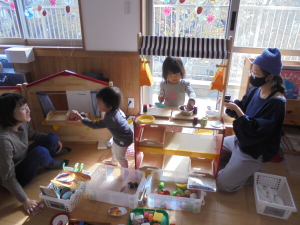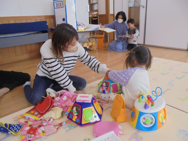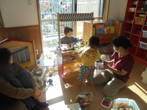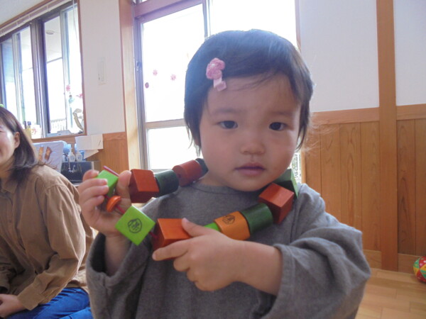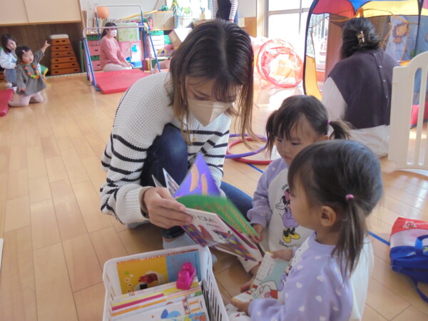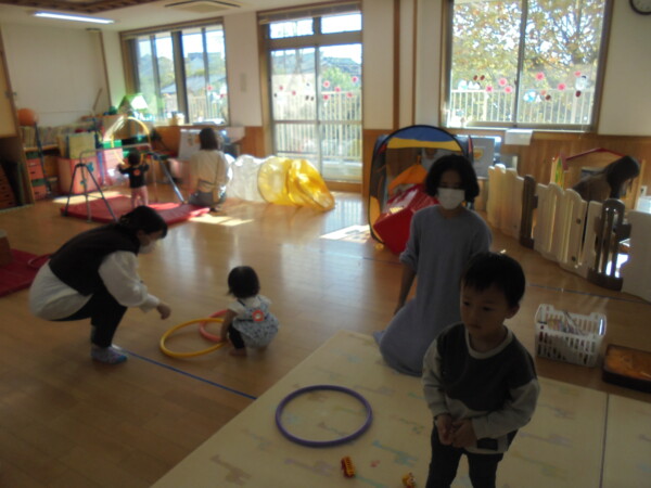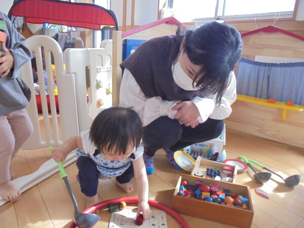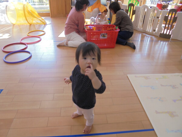 ホールにきてすぐ、自分で遊びを選んで動き出すお友だち、すっかり保育園に慣れた様子でいろいろな表情を見せてくれます。まだ小さいのに、車出して、この本みたいな、などキラキラのお目目でいわれると、なんでもしてあげたくなってしまいます。本当に可愛いお友だちばかりです。お母さまと、子どもたちの会話や仕草などをみていると、こちらもほっとした気持ちになります。子育て大変なときも沢山ありますが育児相談もしています。お話しましょう。来週も遊びにきてくだいね。