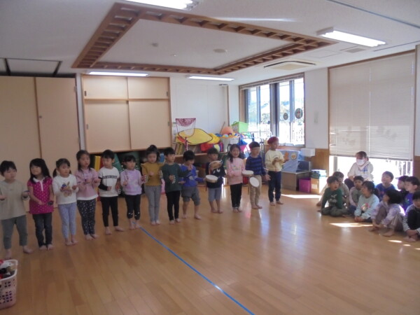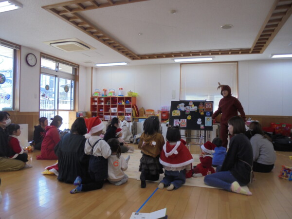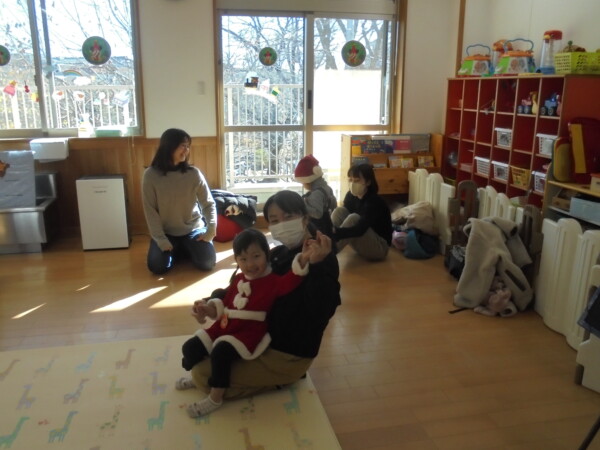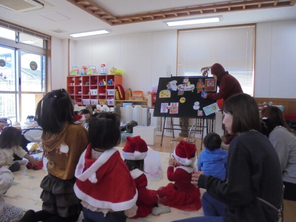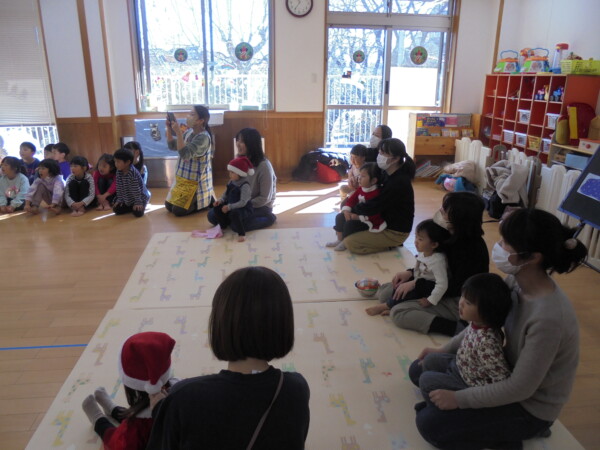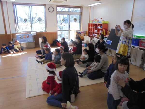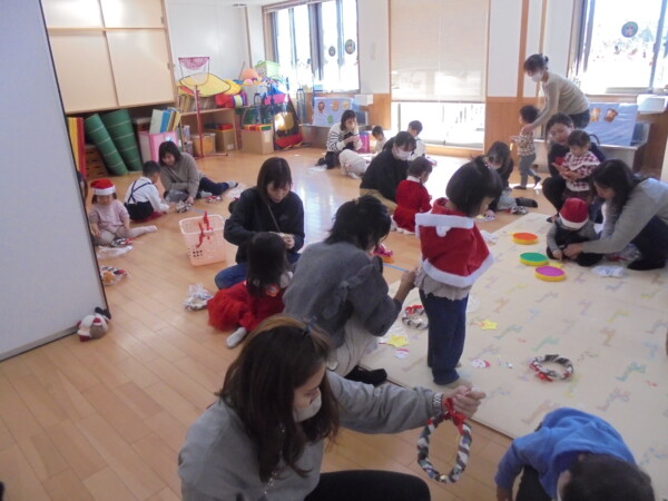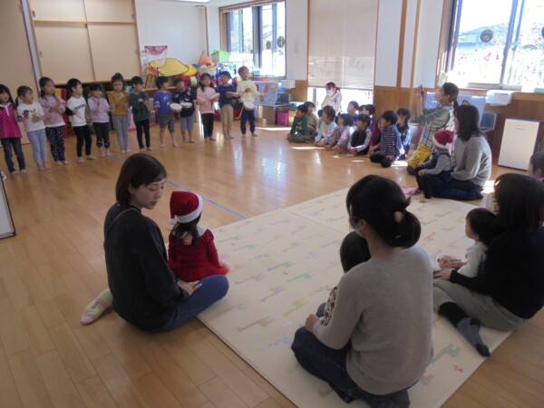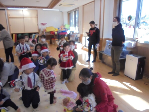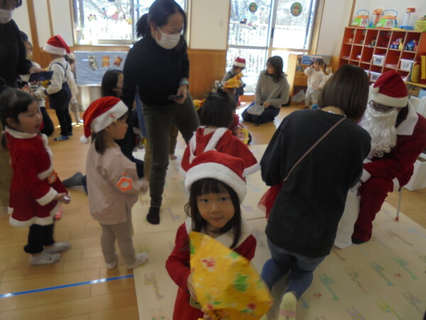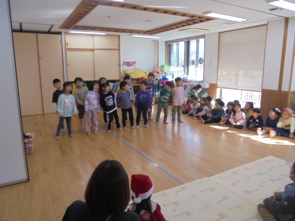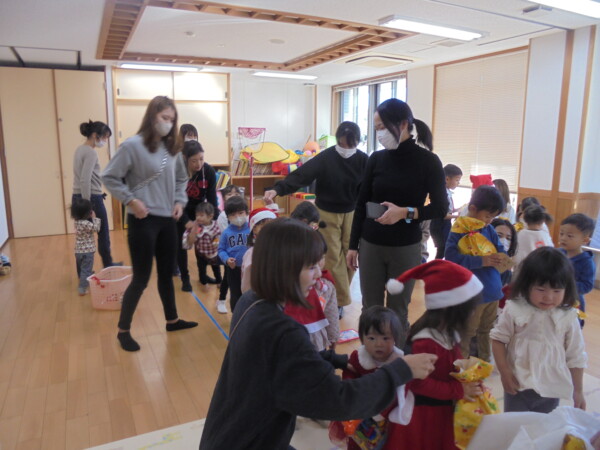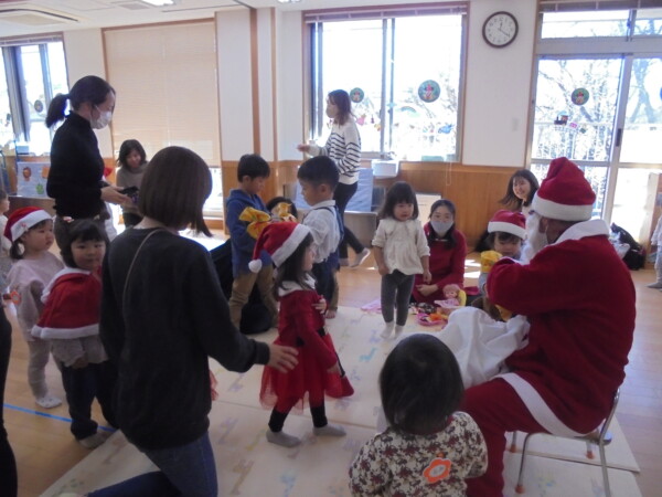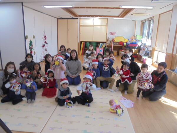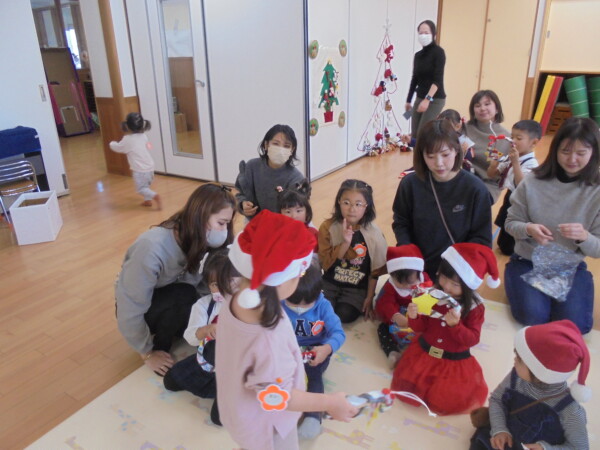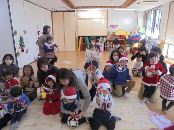 ひまわり組さん、さくら組さんの歌で始まり、みんなでクリスマスツリーにぬいぐるみを飾りました。 サポートしてくれたのは、ひまわり組さんと、さくら組さん。 テープを切って渡してくれたり、優しく教えてくれたりみんなとっても助かりました。 いよいよ、お楽しみ会のはじまりです。 手つくりリースを作ったり、くじ引き大会をしたりサンタさんからのプレゼントをもらいました。 幼稚園のお友達には、お手伝いをたくさんしてもらいました。 ありがとう。