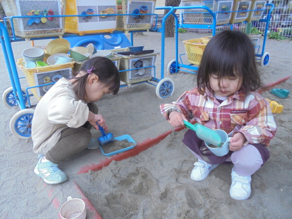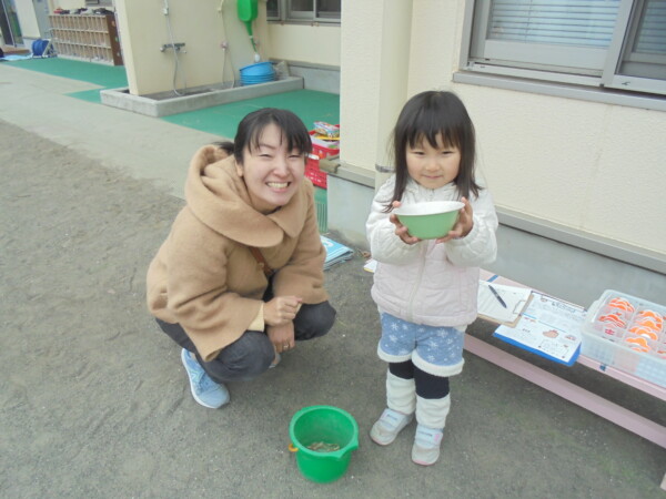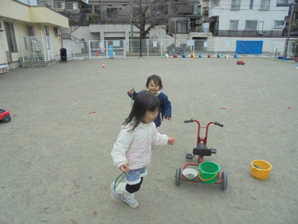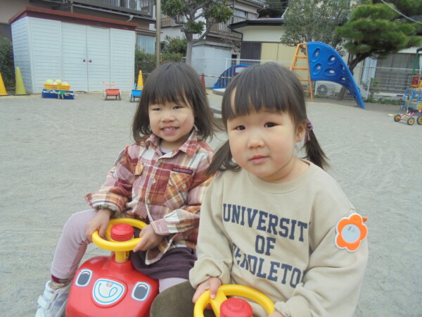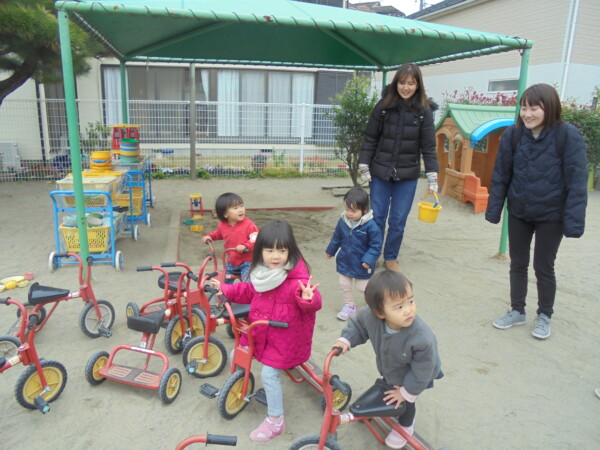 太陽が厚い雲に隠れてとても寒い一日でした。あそこに太陽がいるのにどうして隠れているのかな。早く出てきてくれないかな?そんな話をしていると、顔を出してくれるのですが、直ぐ隠れてしまいます。でも地域のおともだちは、ハウスの中で遊んだり大好きな三輪車に乗って元気いっぱい。最後はみんなではしろう!よーいドン。避難車に乗って園庭を回るのがブームで、手を振ったりニコニコ笑顔がはじけています。来週は園行事で火曜園庭開放はお休みです。また遊びに来てね。