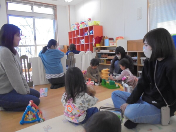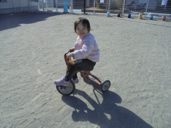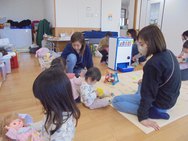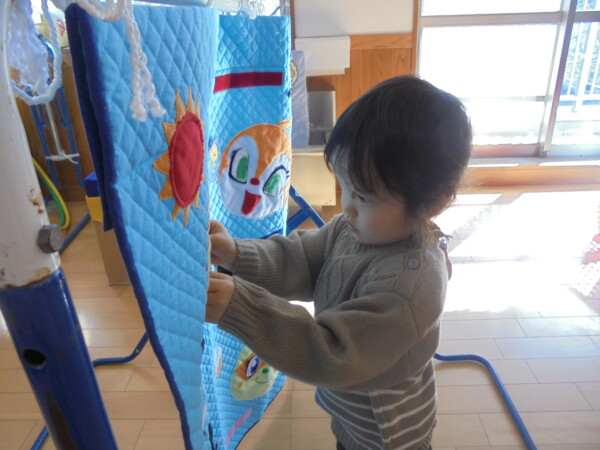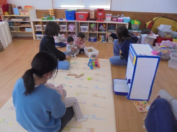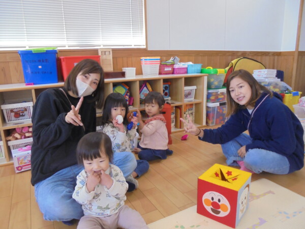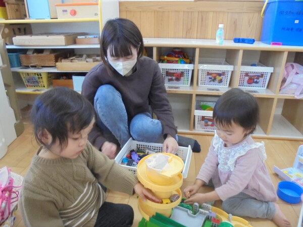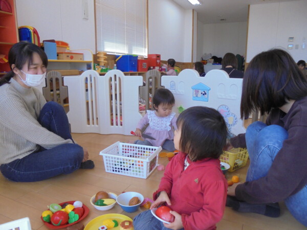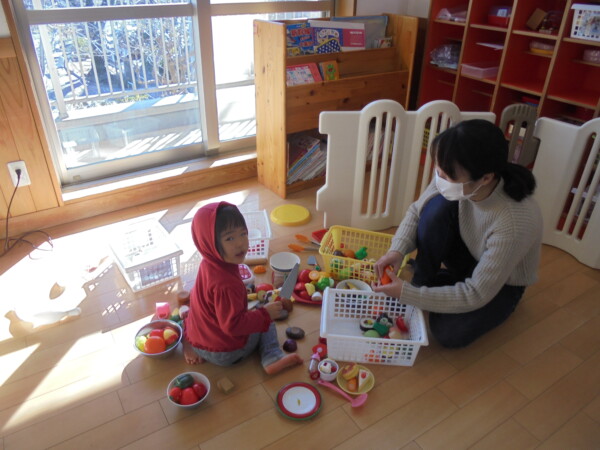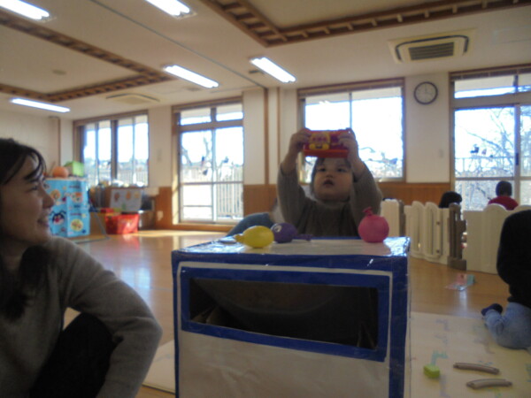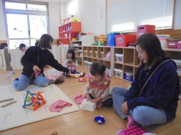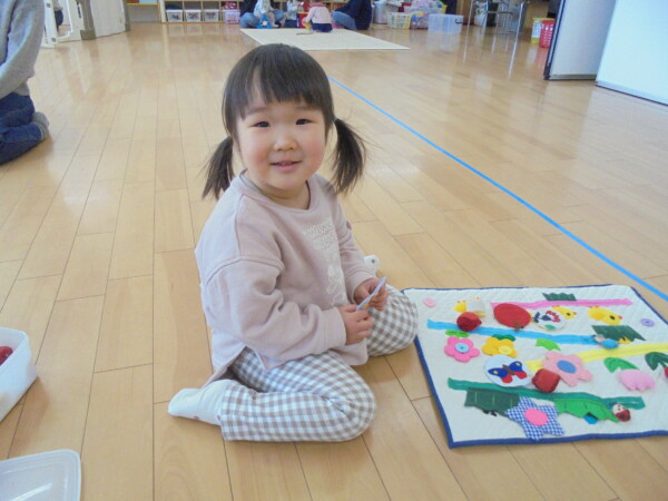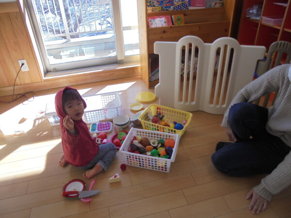 園庭解放の予定でしたが、風が強く室内に変更しました。思い思いのおもちゃを出して、とても楽しそうに遊んでいました。お人形、おままごと、ガチャガチャ、お友だちと一緒に同じ空間を共有し、少しずつですが集団遊びに繋がってきています。子どたちも表情が豊かにリラックスして遊んでいました。保育園でトイレトレーニングができとても喜ばれています。