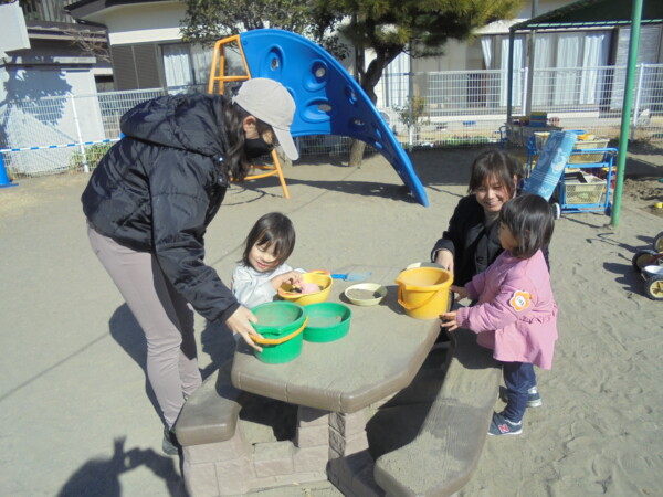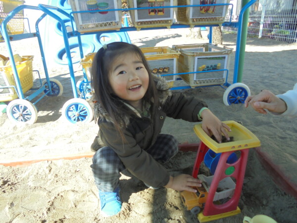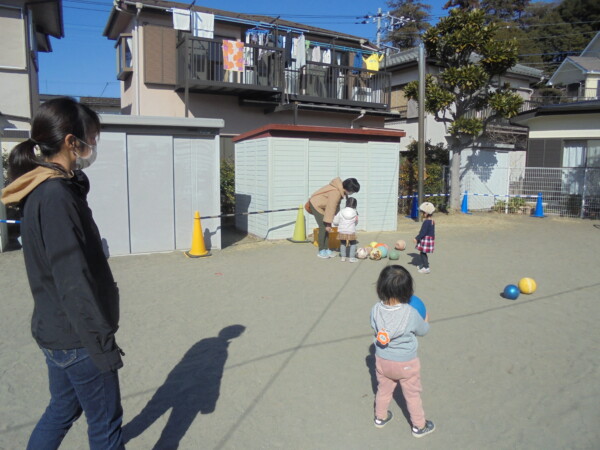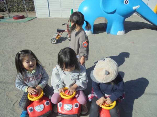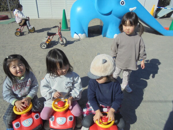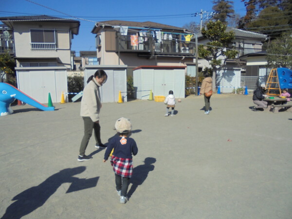 太陽の日差しが柔らかく感じ楽しい園庭開放になりました。三輪車が大人気、みんな上手になっています。今日のお楽しみの時間は鬼ずくし。鬼のパンツの絵本。踊って、お面のいないいないばあっ!節分には完ぺきに踊ろうね♡