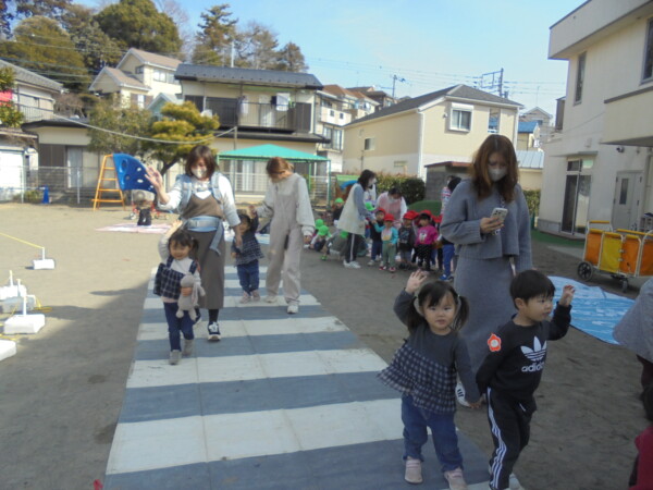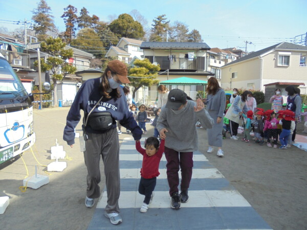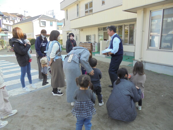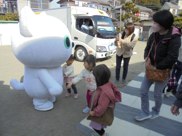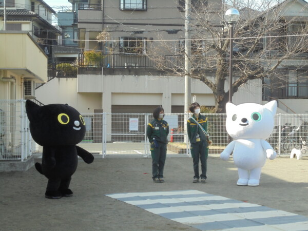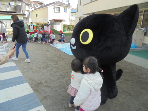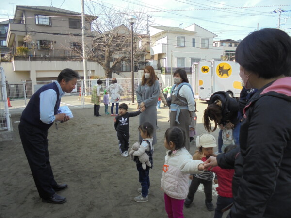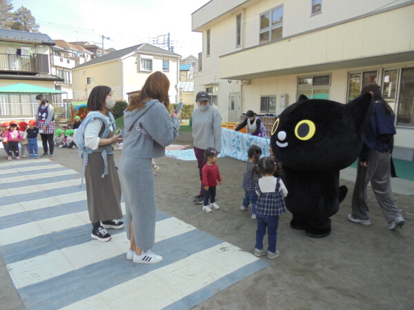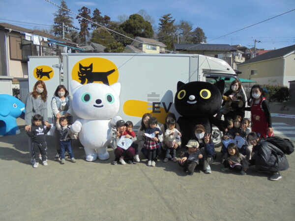 今日はクロネコヤマト交通安全教室がありました。クロネコヤマトの車を使って、「車の近くでは遊ばない」など危ないことがいっぱいあるというお話をして下さいました。ここで、スペシャルゲスト。しろねこちゃん、くろねこちゃんが登場。横断歩道を渡るときのルールを教えてくれました。ママ!!子どもたちと練習してくださいね。事故のないようこれからも交通ルールを守りましょう。