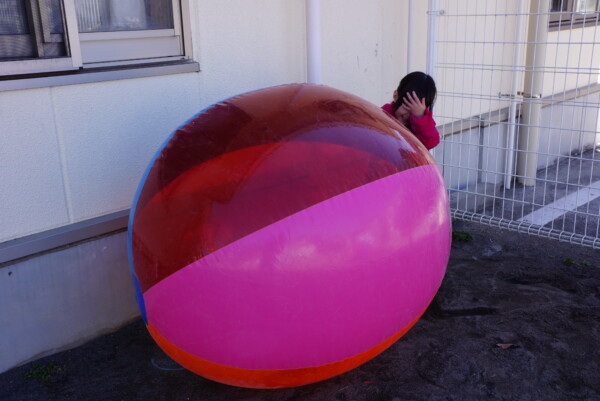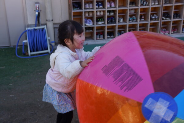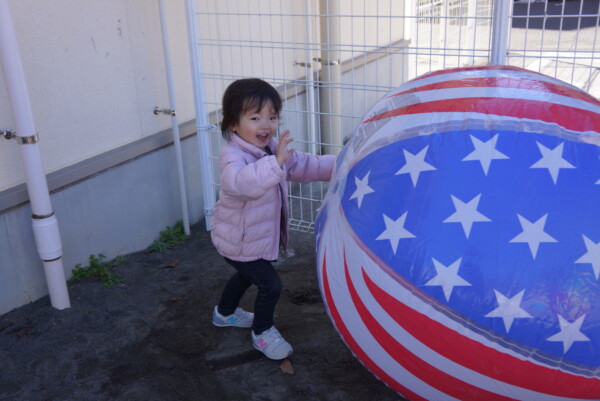 今日は大きな大きなボールが地域のみんなの仲間入りをしました。とっても元気なボールですぐ風とお友だちになって、園庭をひとりで転がっています。さっそくボールを見つけたお友だち!!ハーハ―言いながらボールと戦っていました。今週は保育園に来る日が三日続きます。火曜園庭開放、親子体操、クロネコ安全教室、楽しみですね。