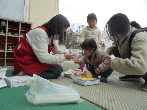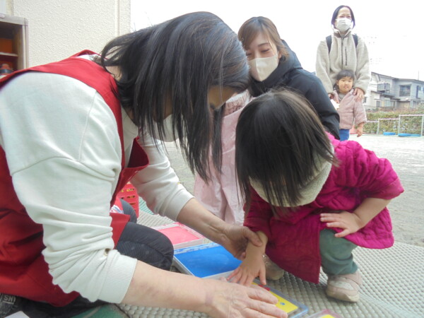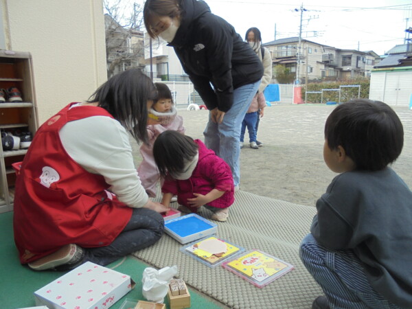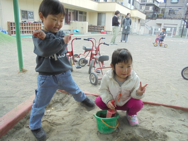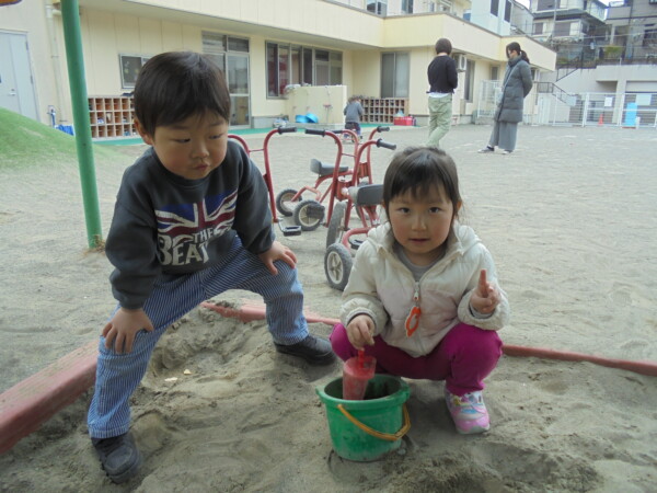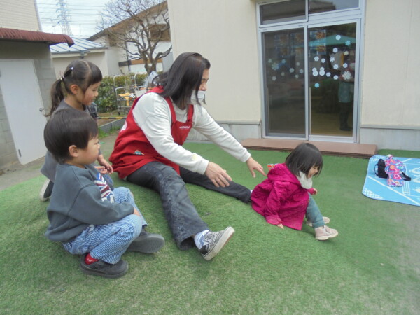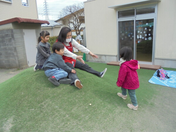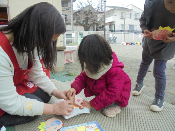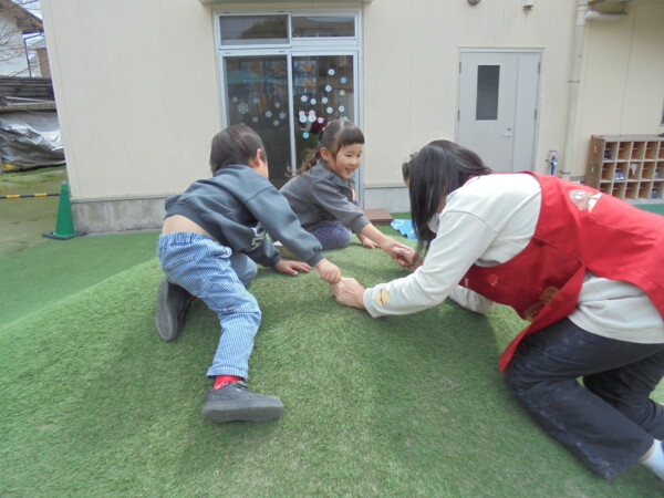 幼稚園がお休みになったので久しぶりに、二人のお友達に会うことが出来ました。今日は、助けてごっこがしたいと、元気いっぱい。柴山に登り、助けて!の声。みんなで引っ張ったり、転がったり、楽しい時間を過ごしました。また遊びに来てね。今年度の記念に、手形をとりました。