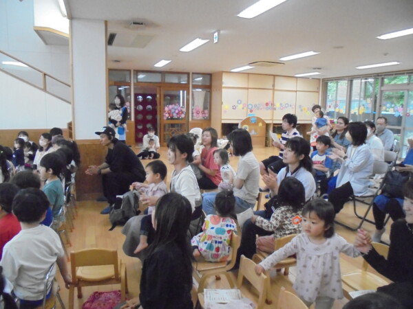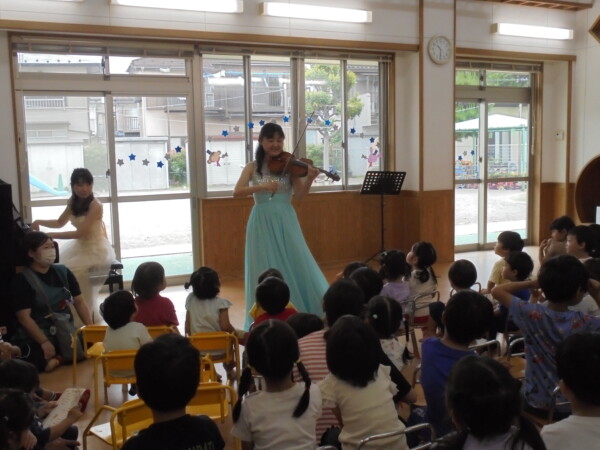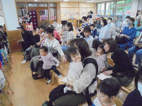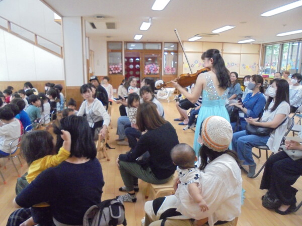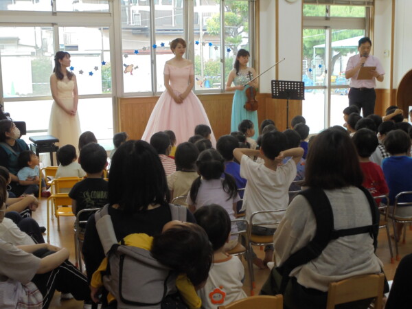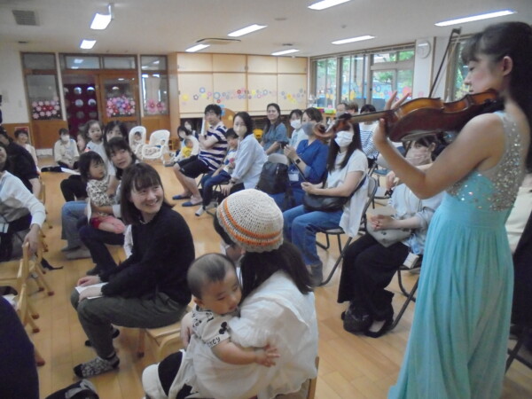 保育園でコンサートがありました。みんなの目がキラキラしています。どうしてか?3人のお姫様が登場したからです。ピンク・イエロー・ブルーのドレスを着たお暇様が素敵な歌と楽器を演奏してくれました。子どもたちには、不思議な世界のご招待だったと思います。曲にあわせてリズムをとったり、手をたたいたり体で表現したりとても楽しい時間でした。ママも大喜びでした。