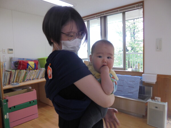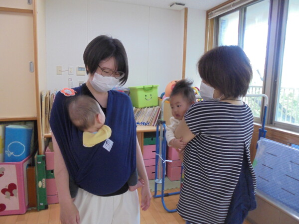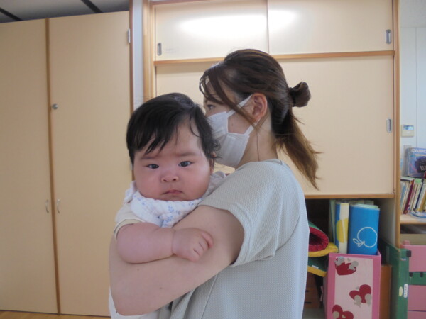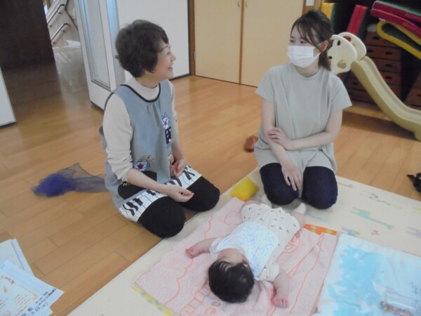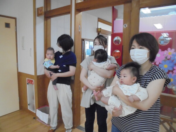 今日は3人のお友だちが赤ちゃん教室にきてくれました。初めての保育園にお母さま方が興味津々でした。子どもたちも初めてみる不思議な世界に、目をきょろきょろしています。リズムを見てもらったり、ママ達とお話をしたり、園長先生の育児相談もありました。これからママのリラックスできる場所作りを目指していきます。たくさん遊びにきてくださいね。明日は親子体操があります。