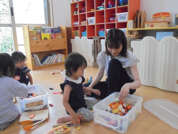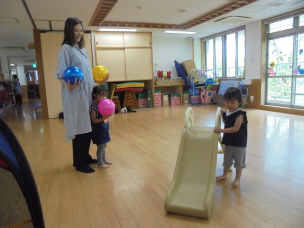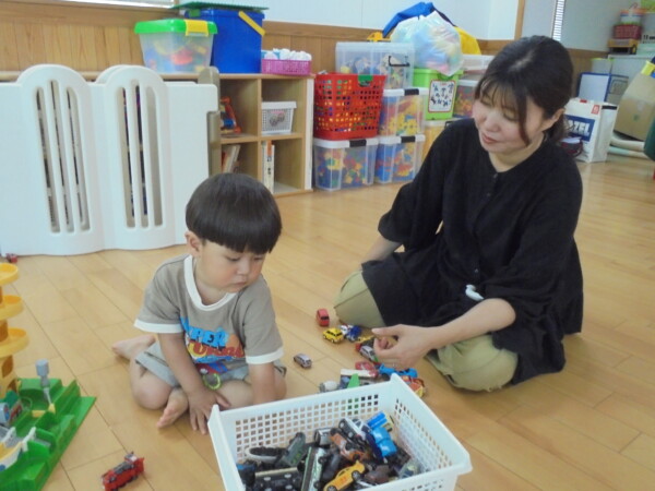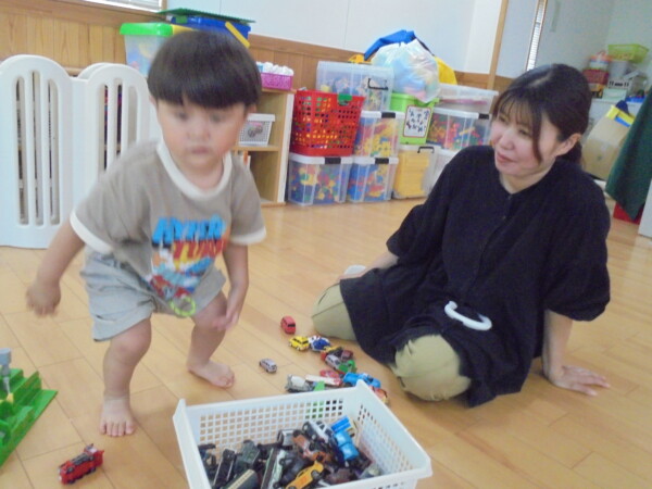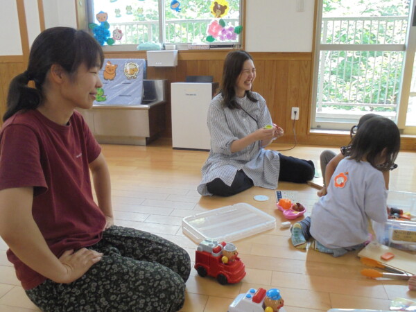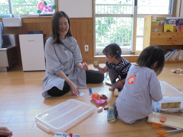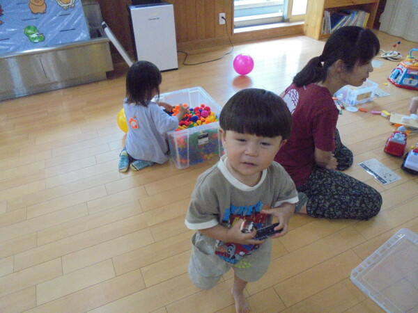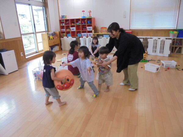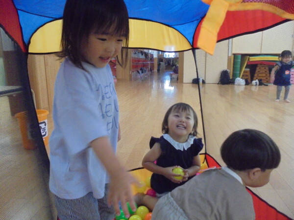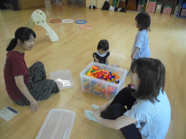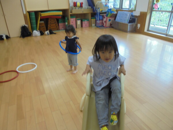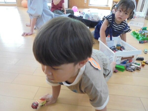 今日は園庭開放の日でしたがとても暑い日だったので、熱中症対策として室内に変更になりました。お部屋では好きなものを出して自由遊び。お寿司屋さん、ブロック、お人形さんに、ボール、子どもたちの笑顔が溢れていました。最後にはお片付け。パパっと、上手にできました。みんなすごいね。お楽しみは動物村♬ここはここは、動物村・・・♬みんながしぜんに声が出てみんなで合唱しました。またうたおうね。