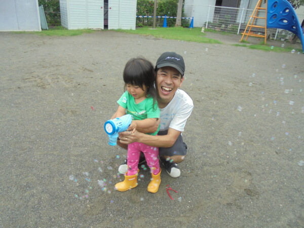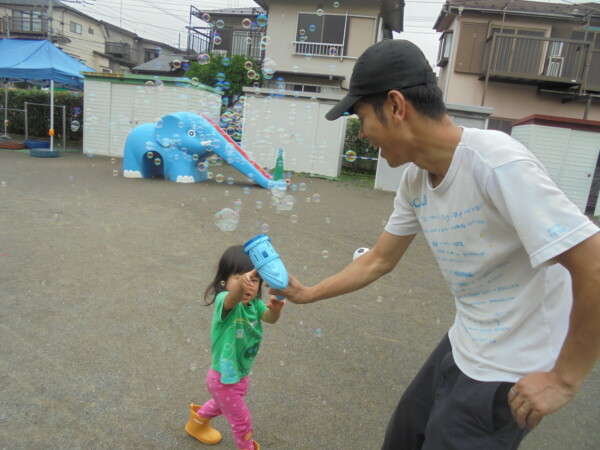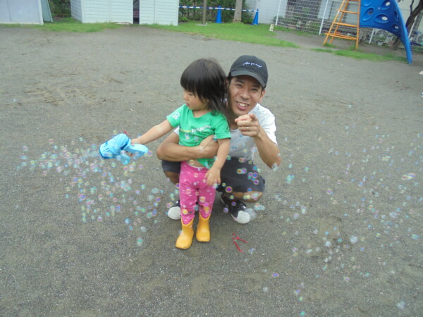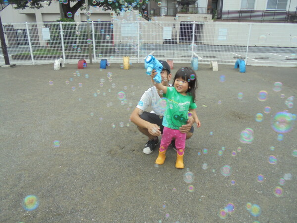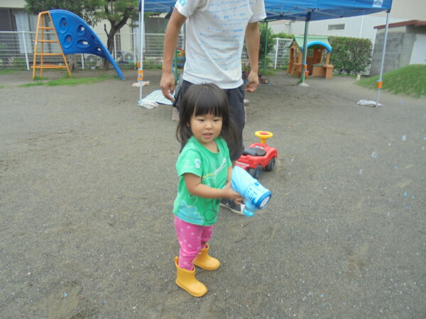 時間になると雲の隙間から青空が見えてきたので二組のお友だちがきてくれました、が。さあ大変!少し曇ってきたかなと思ったら、大粒の雨が・・・・。途中で園庭開放が中止になってしまいました。少しの間ですがシャボン玉遊び、ボールで遊ぶことが出来ました。そろそろ梅雨が明けますが、アラートが出た時は園庭は中止になるのでお部屋で遊びます。お知らせを門の前に貼りますのでご覧になってください。