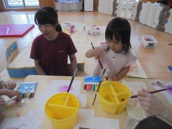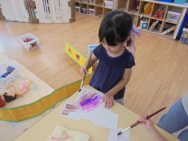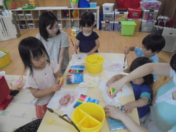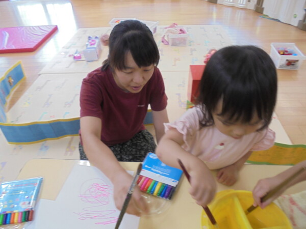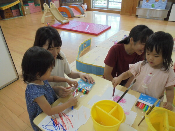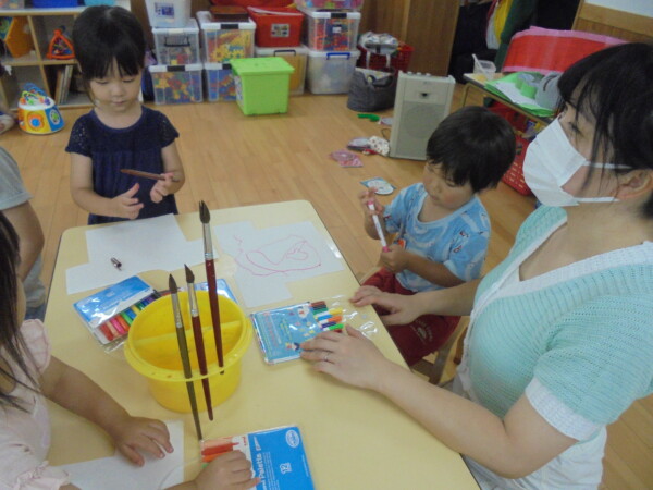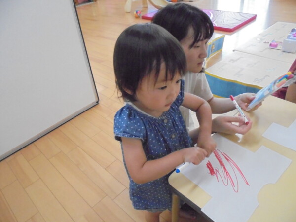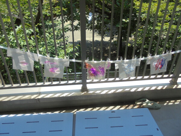 アラート発令の為室内に変更になりました。園庭での水遊び、楽しいですがこの暑さは楽しさを吹き飛ばして危険な感じがします。室内はとても涼しいですよ。体を休めて下さいね。今日はみんなでお洗濯遊びをしました。ペンで色を付けて洋服の形をした洗濯物をつくりました。上手に干せましたね。次もまたお洗濯しようね。