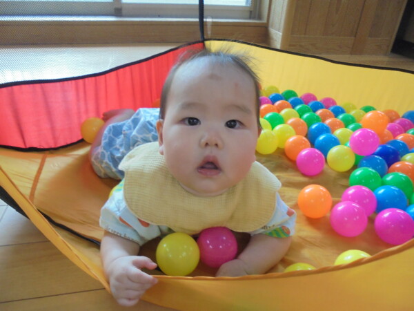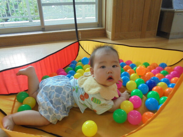 今日は一人だったのでちょっと寂しい赤ちゃん教室になってしまいましたが、途中から園見学のお友だちも参加。賑やかになりました。ママのお膝から離れて遊びだしたり、トンネルも一人で初挑戦。ボールハウスも体験しました。