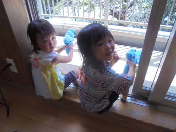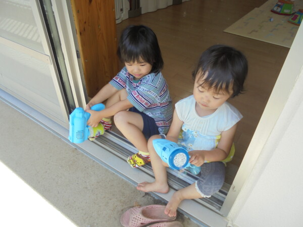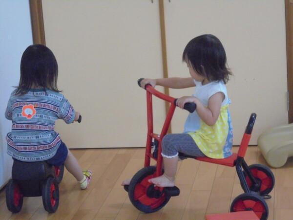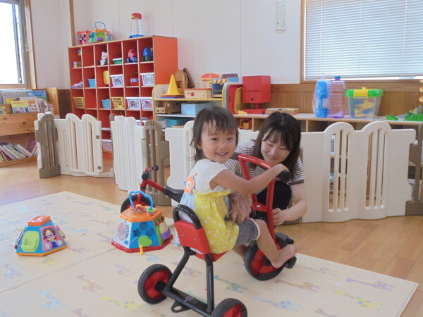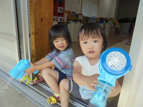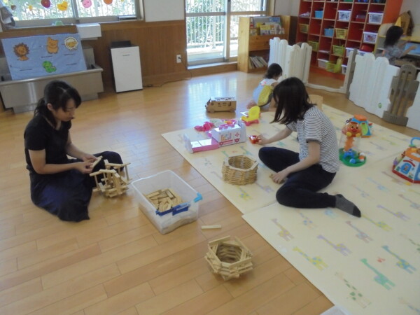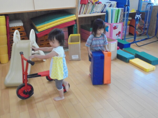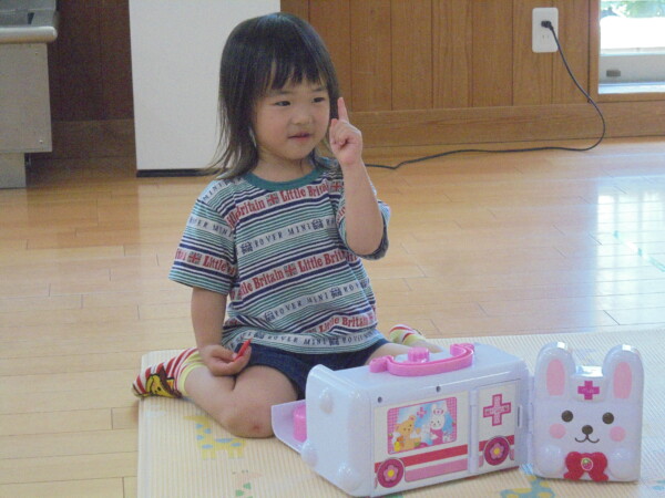園庭あそびの日でしたが、猛暑のため室内遊びに変更。多目的ホールで遊びました。室内は、エアコンがきいていてとても過ごしやすく、喜ばれました。子どもたちは窓際でシャボン玉をしたり、三輪車に乗ったり、初めてのおもちゃのカプラでお母さんも、子どもたちも楽しい時間を過ごしました。絵本は桃太郎、飛び出す桃太郎に、さいごまでよく見てくれました。