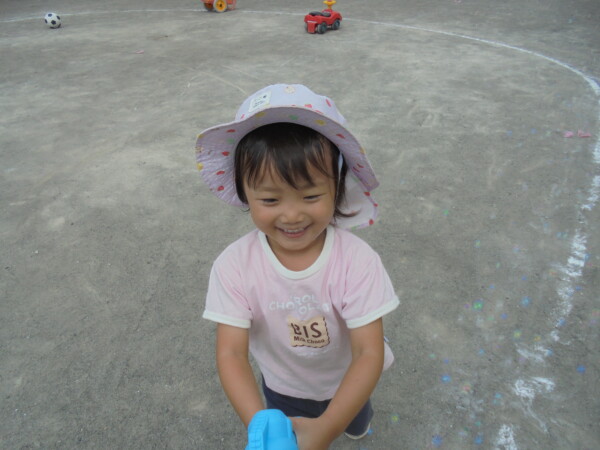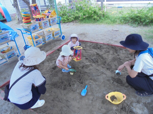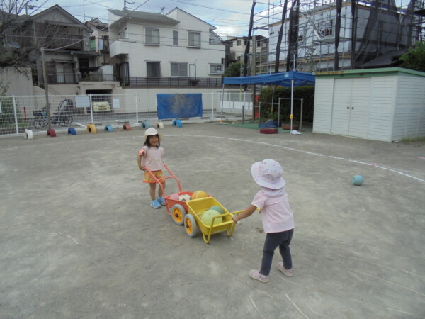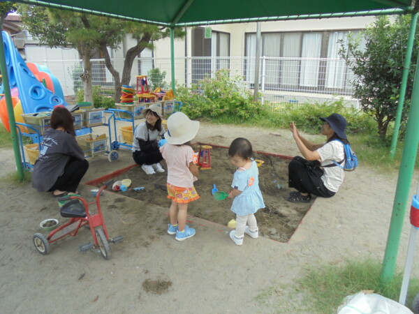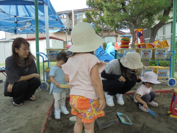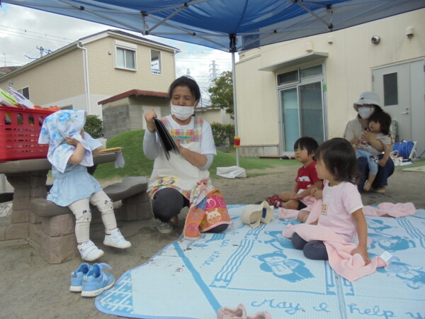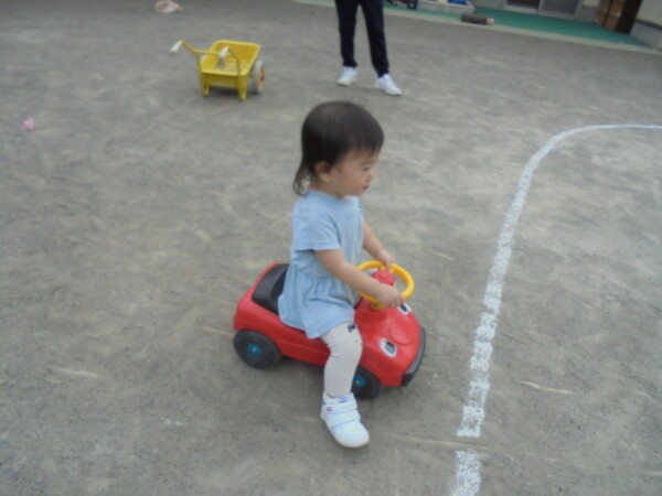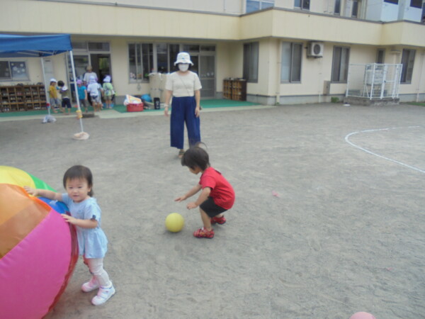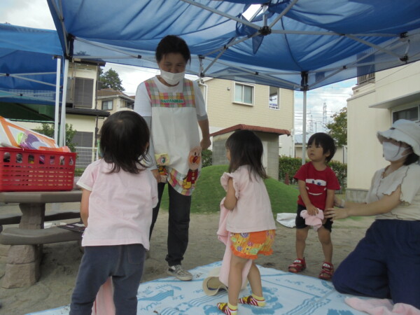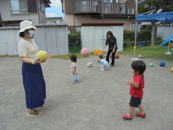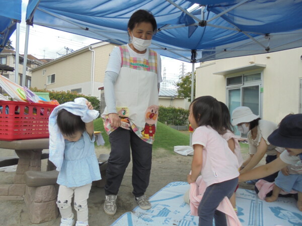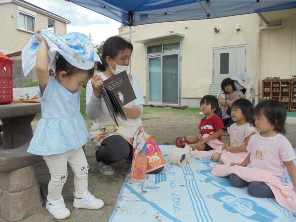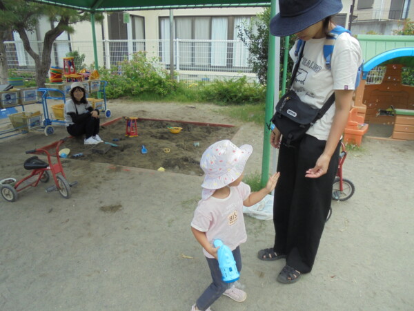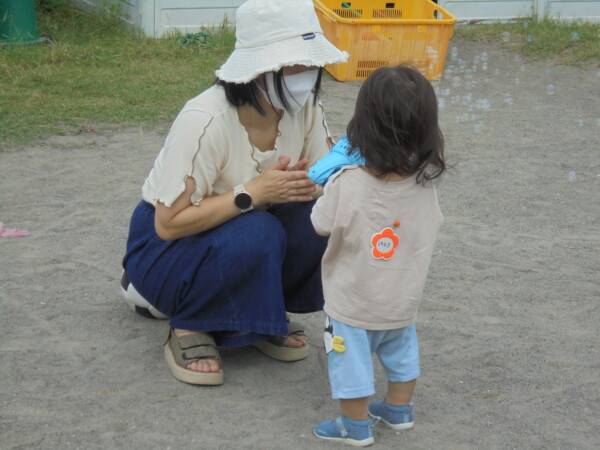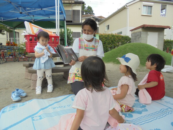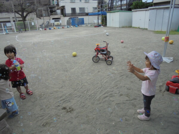 外遊びで体を動かすのにはとても良い季節となりました。運動会の練習を行っているさくら組さんのリレーをみて「もっと見たかった」と、おかあさん。子どもたちの一生懸命な姿はワクワクします。地域のおともだちはシャボン玉が大好きです。小さなお友だちが、シャボン玉ができるようになり、自慢気に何回もチャレンジしていました。今日は押し車、ジャンピングにも挑戦。とっても楽しんでいました。お楽しみはまねっこ どきー。本に合わせてタオルを使ってまねっこをします。今日が一回目。これから何回も練習して変身上手になります。お弁当箱にあわあせてお弁当作りも上手になりました。
