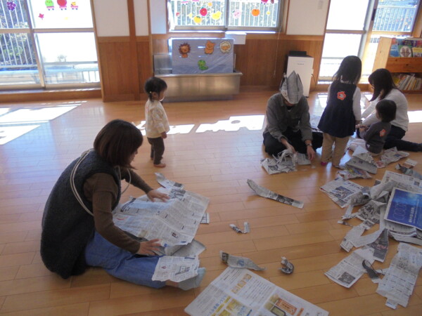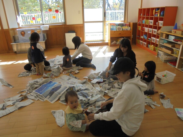組のお友だち。絵本を使って身近にある音遊びをしました。小さなおともだちはまねっこが上手。ポロンというと、ちいさなポロンがかえってきたり、ぽきっというと、あちらからポキッがきこえてきます。真似っこしながら、たくさんの音を楽しみました。久しぶりの新聞遊びも楽しかったね。健康相談もありました。