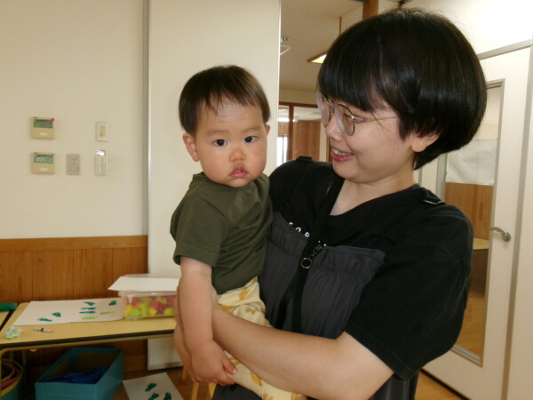 初めてのお友達も参加。みんなでお話ししたり、楽しい時間を過ごしました。今日のメインは絵の具で足形をとりました。初めての絵の具です。足形であおむしくんを作ります。楽しみにしててくださいね。