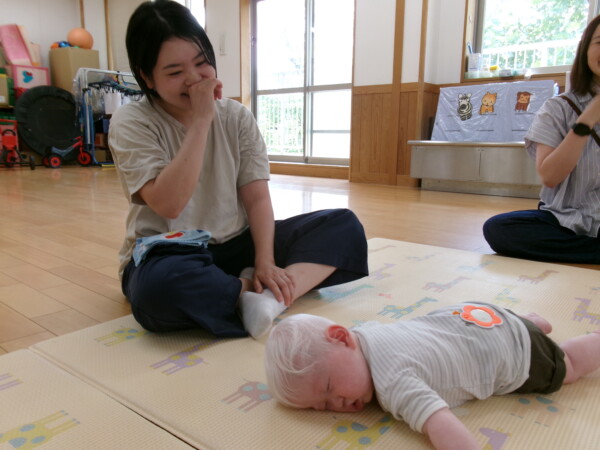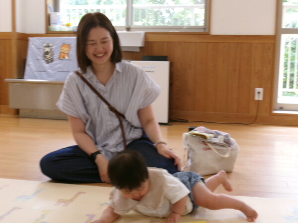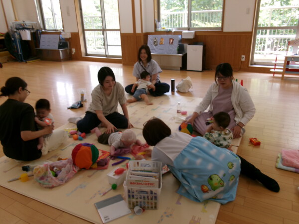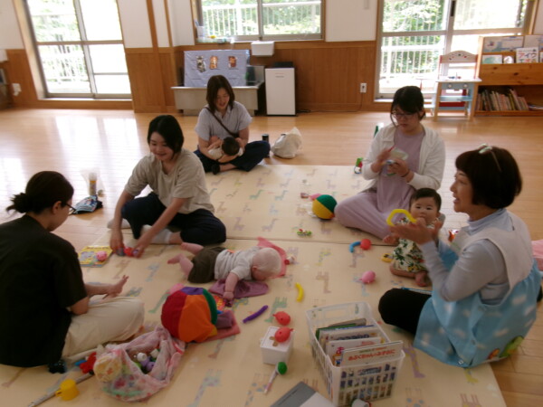 あかちゃん広場の親子の参加が定着してきて子どもたちの成長がみられるようになりました。お母さま同士がにこやかに会話をすることが出来、アットホームな会になっています。園長先生が参加してくださり、さらに会話が広がりました。月齢が様々なので成長の過程がみれ、お母さまたちの意見が参考になっているようです。暑い日々が続きます。涼しいお部屋の中でいっぱいお話ししましょう。まってまーす!