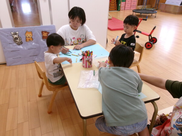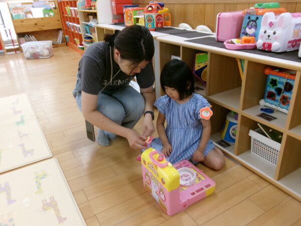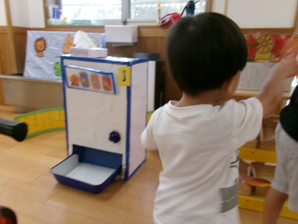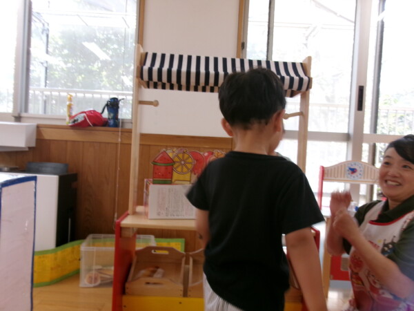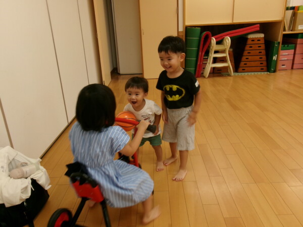 今日は、大きなお友だちの天国の園舎開放になりました。アイスクリーム屋さんごっこ「いらっしゃいませ、何にしますか?」「いちご、チョコレート・・・」かわいいお店屋さんで大盛況でした。次はおいかけっこ、スピードを出して元気いっぱいです!途中から三輪車に変わったりニコニコ笑顔がはじけていました。最後は、お楽しみ、エプロンのどろんこねこちゃん。みんなにシャワーをかけてもらってとても嬉しそう。りんごごろごろも見たよ!まだまだ暑い日が続きます。たいちょうを崩さないよう気をつけてくださいね。