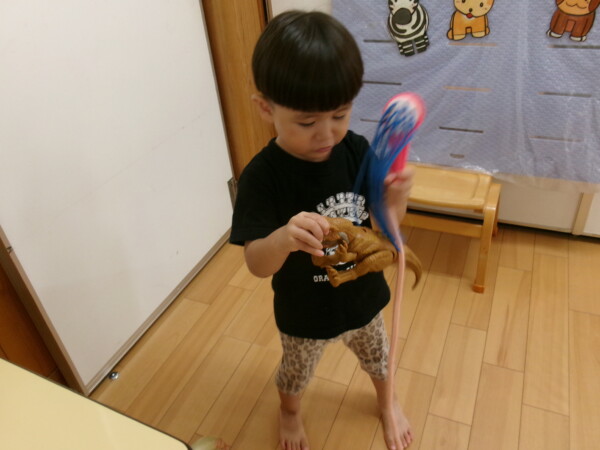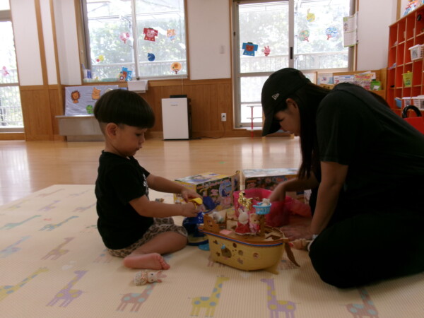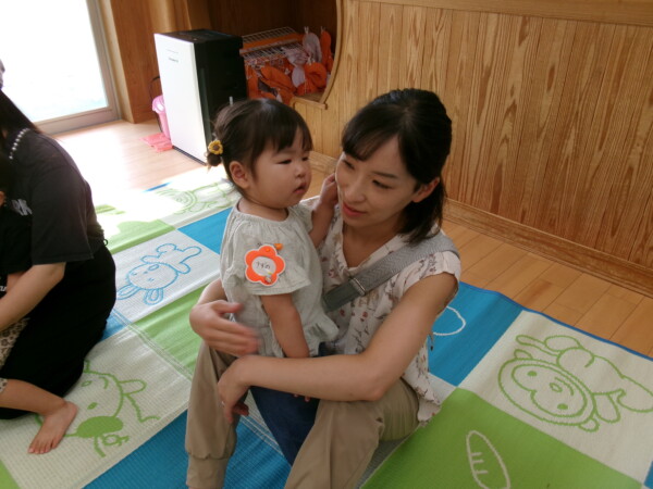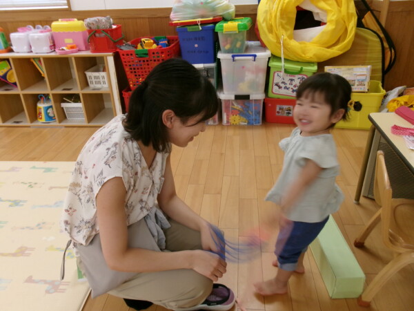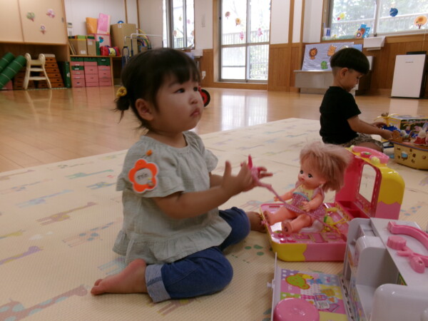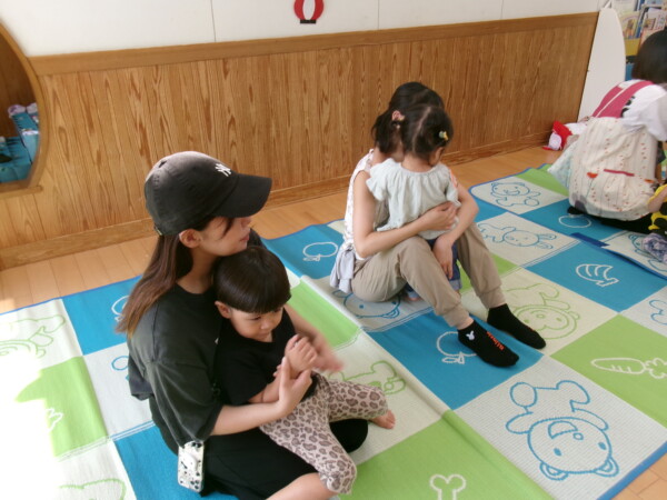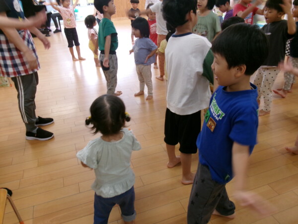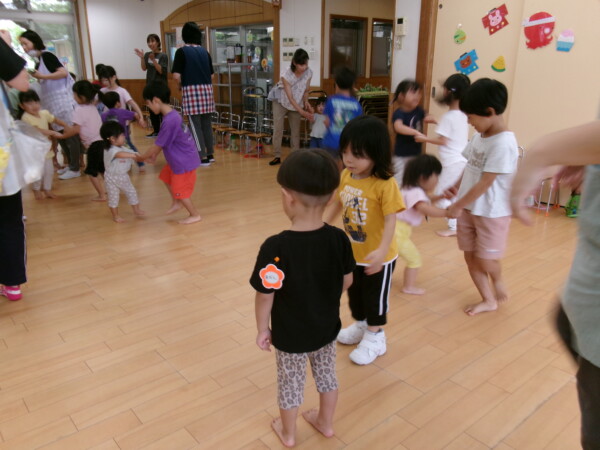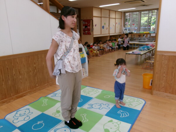 参加者が少なく残念でしたが、回数を重ねる事により、子ども達も慣れ母親から離れる事が出来るようになりました。さくら組さんと手を繋いでリズムに参加していました。リズムの後は、多目的ホールで自由遊び!エプロンシアターのどろんこねこちゃんにシャワーをかけるのが楽しく、笑顔、笑顔でした。次回の地域リズムは、9月16日です!ふるってご参加下さい。