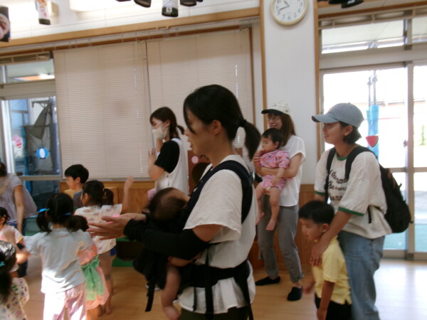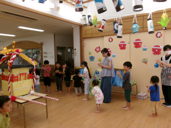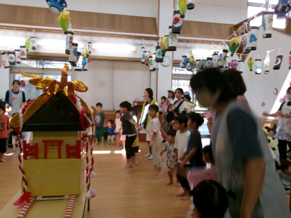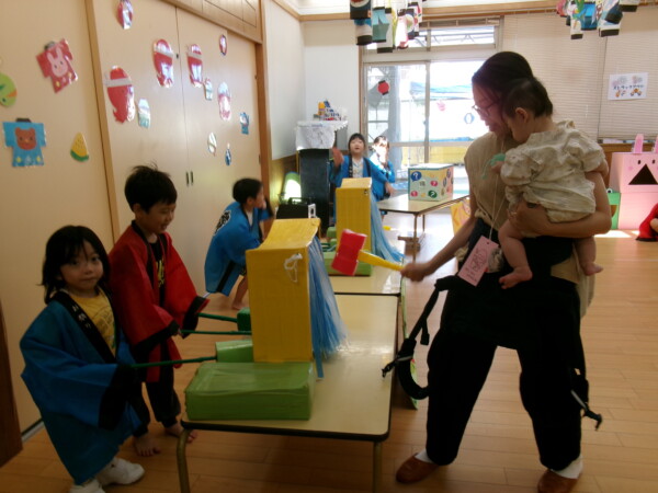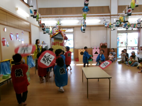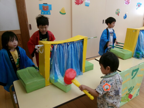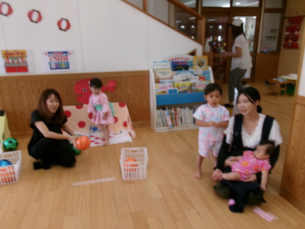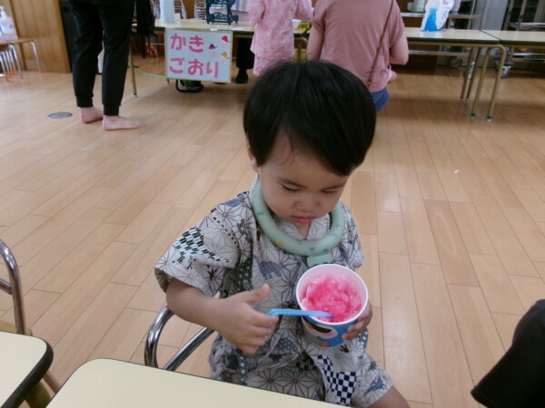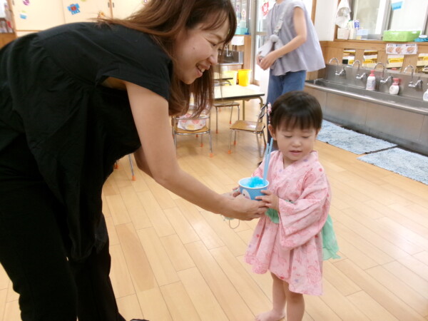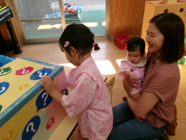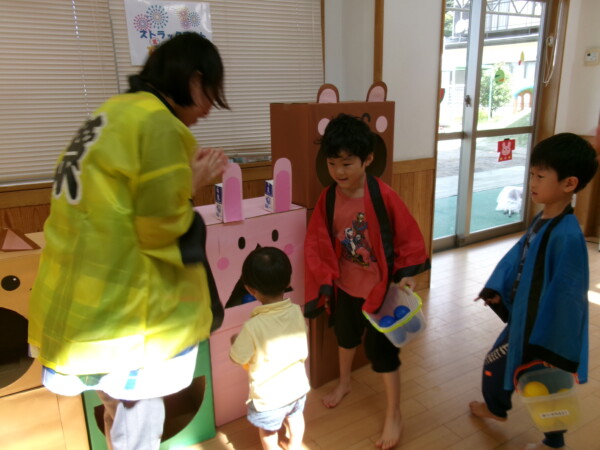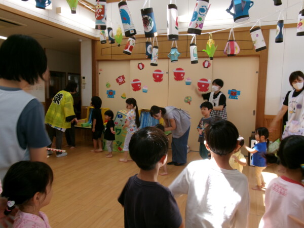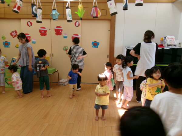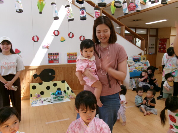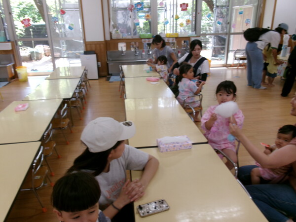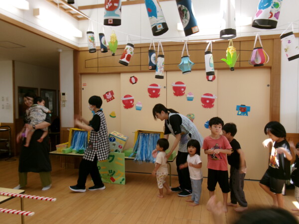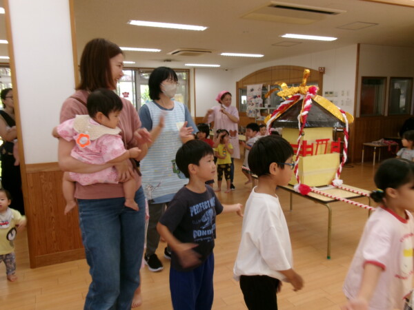 皆が楽しみにしていた夏祭り。始まるよーっ!チケットをもらって夏祭りに参加。ママたちの方がワクワク、ドキドキです。浴衣を着てくるお友だちもいて雰囲気は最高調。一階ホールからは、さくら組さんの「いらっしゃいませー、いらっしゃいませー」の元気な声。バックミュージックは笛や太鼓が聴こえてきます。ゲームをしたり、かき氷や綿あめを食べて夏一番の夏祭りを楽しんでいます。30分があっという間に過ぎ最後はお神輿の登場!「わっしょい、わっしょい」の掛け声と盆踊りを楽しんで夏祭りが終わりました。とっても楽しかった、という声を沢山いただいてこれからも地域のお友達と一緒に楽しいことをいっぱいしましょう。