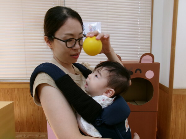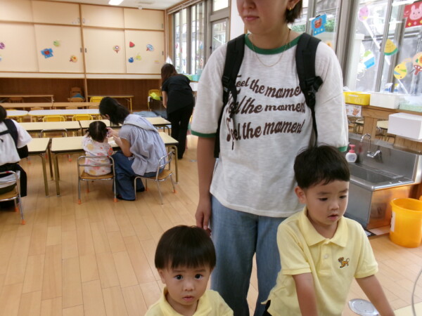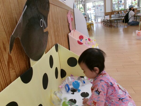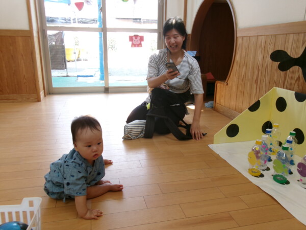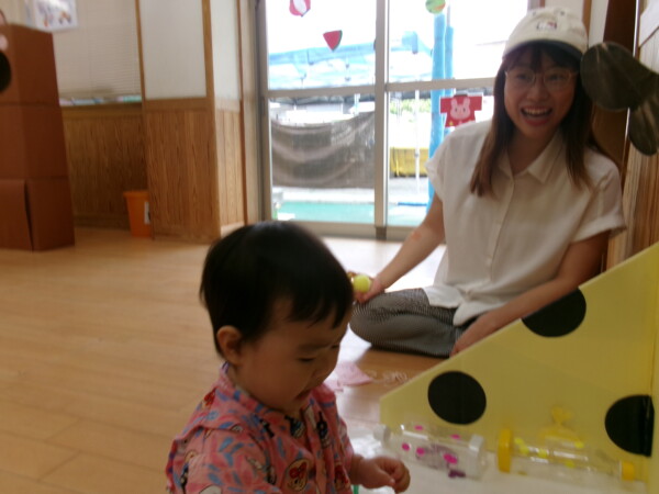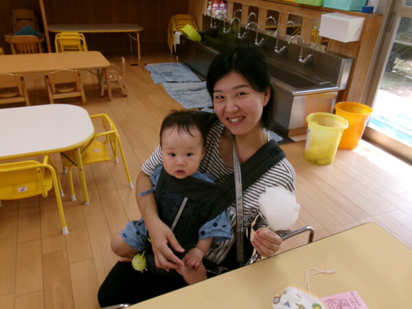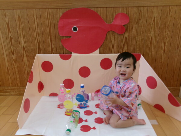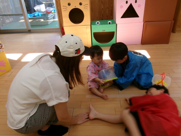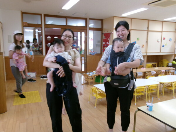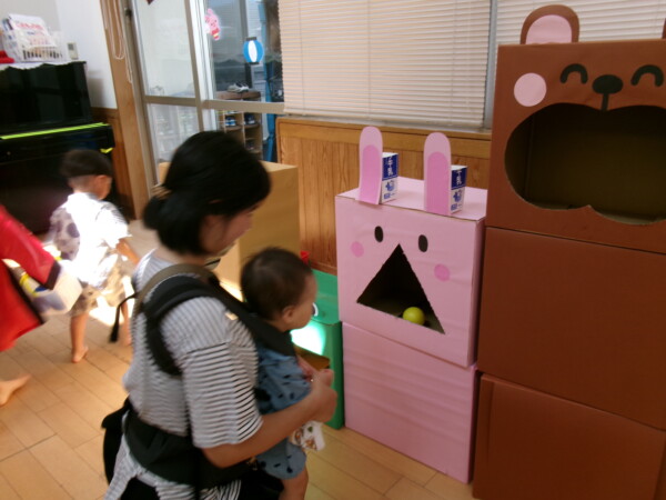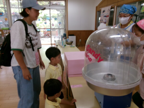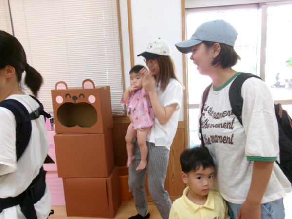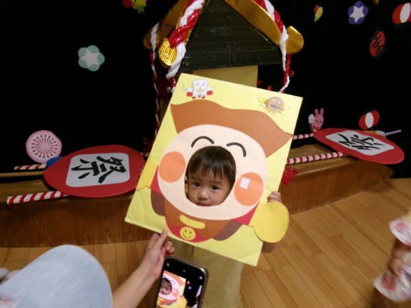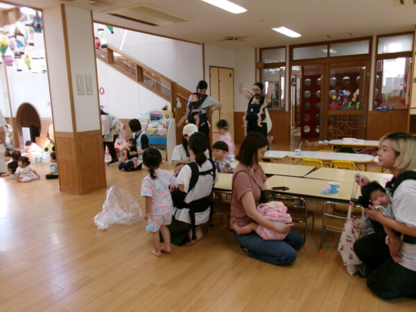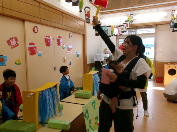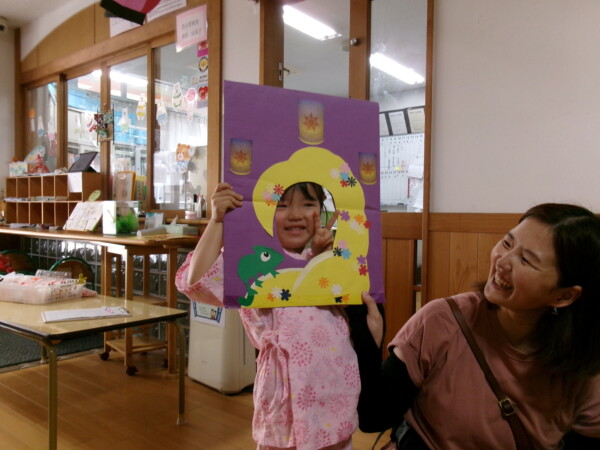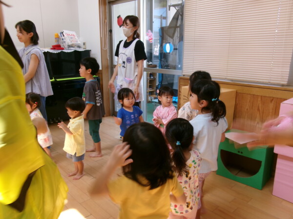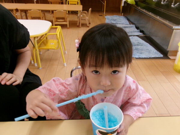 皆が楽しみにしていた夏祭り。始まるよーっ!チケットをもらって夏祭りに参加。ママたちの方がワクワク、ドキドキです。浴衣を着てくるお友だちもいて雰囲気は最高調。一階ホールからは、さくら組さんの「いらっしゃいませー、いらっしゃいませー」の元気な声。バックミュージックは笛や太鼓が聴こえてきます。ゲームをしたり、かき氷や綿あめを食べて夏一番の夏祭りを楽しんでいます。30分があっという間に過ぎ最後はお神輿の登場!「わっしょい、わっしょい」の掛け声と盆踊りを楽しんで夏祭りが終わりました。とっても楽しかった、という声を沢山いただいてこれからも地域のお友達と一緒に楽しいことをいっぱいしましょう。