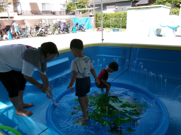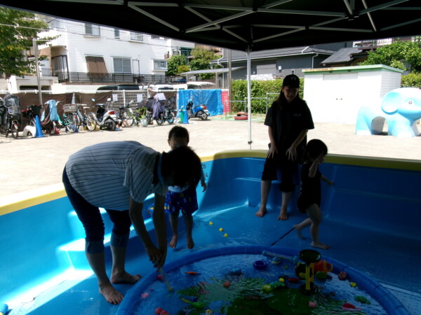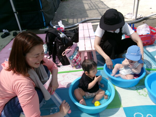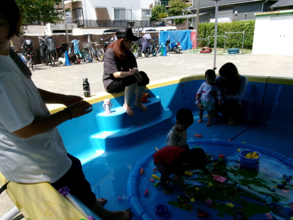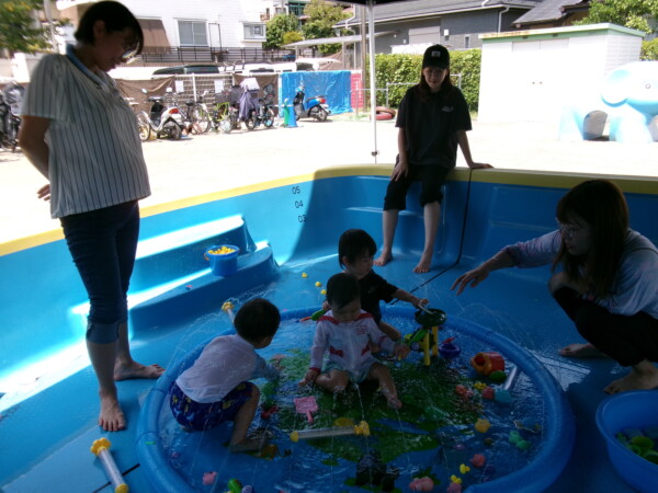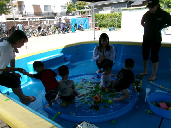 2回目の地域水遊びがありました。赤ちゃんの参加もあり人数は、少な目でしたが楽しい時間を過ごすことができました。プールの中では、お母様たちが積極的に子どもたちに関わってくれて親子での笑顔がたくさん見ることができ夏ならではの遊びが楽しめたととても好評でした。オムツのポリマーがいっぱいになりあひるさん姿の子どもたちはとてもかわいいのですが、動きが制限されることもあるので、家にプール用のオムツがある方は持参してください。