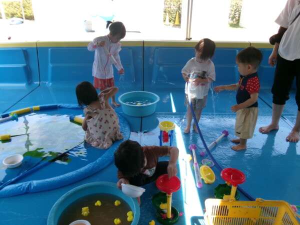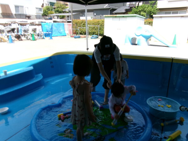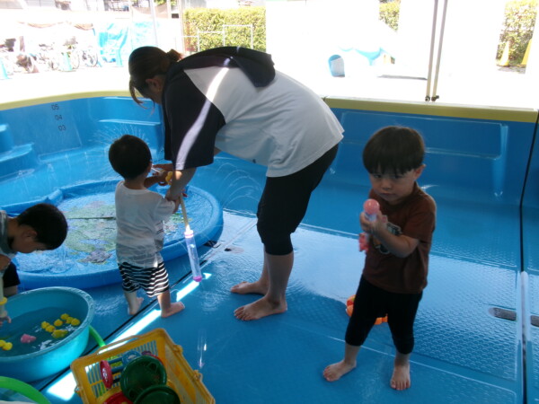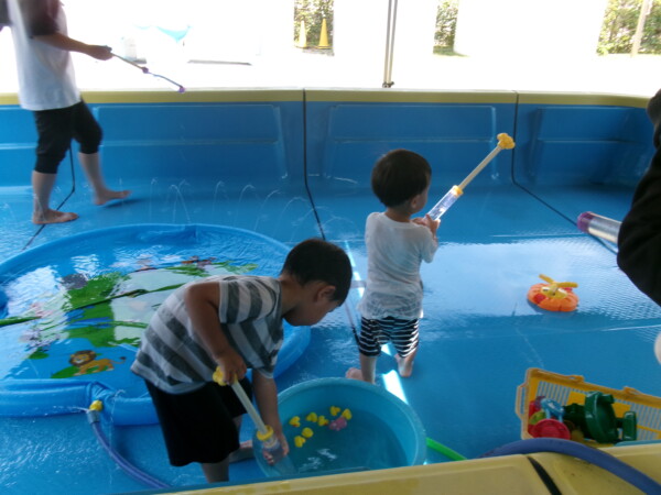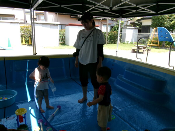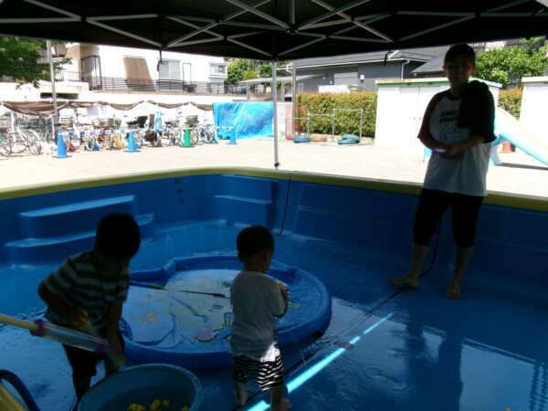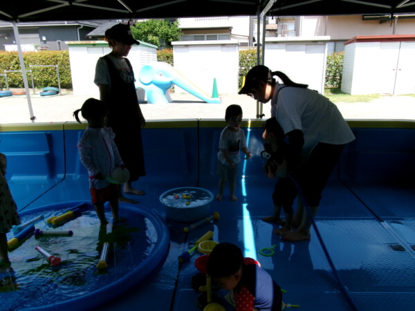 8月に入り、本格的な水遊びがはじまりました。どの子ども達も首を長くしてまっていました。0さいのおともだちは、ワンルームマンションのタライのプールです。初めてのプールでママも心配している様子でしたが、水も怖がらずおもちゃで遊んでいました。プールの中は、ホースを使って水遊びをしたり水鉄砲で水を掛け合ったり、ニコニコ笑顔がはじけていました。ママたちも協力してくださったので楽しい水遊びができました。