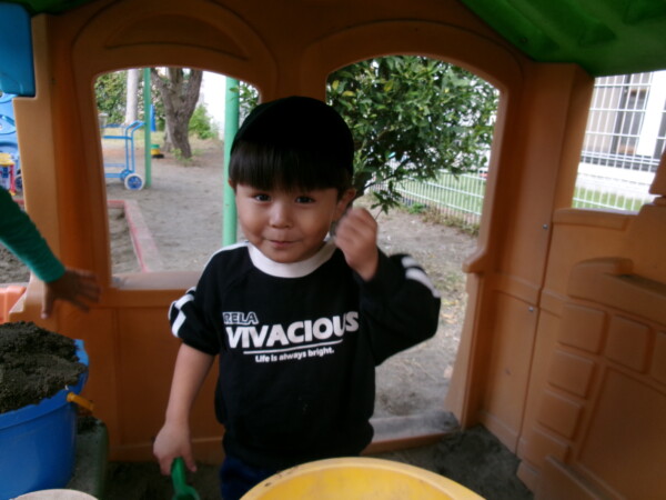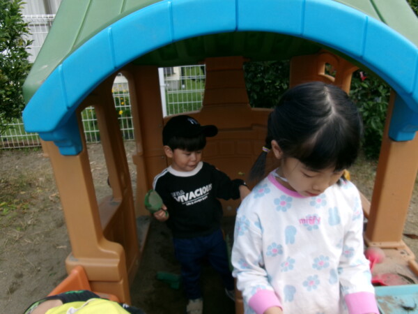 お友だちは1人でしたが、さくら組のお兄さん、お姉さんとハウスの中でいっぱい遊びました。ハロウィンのパネルでは歌に合わせてカードをめくったり、おバケを動かしたり、楽しかったね。また遊びに来てください。