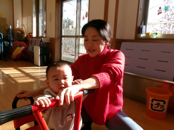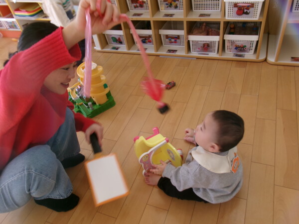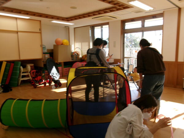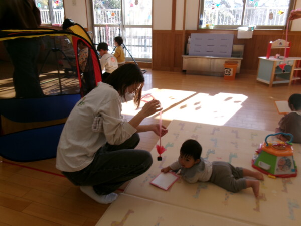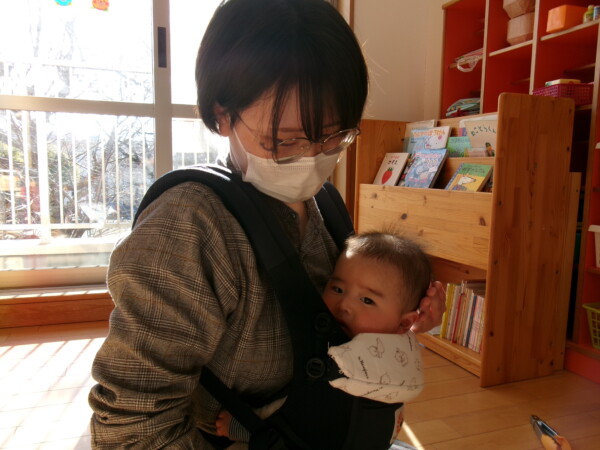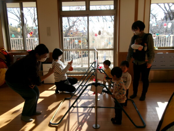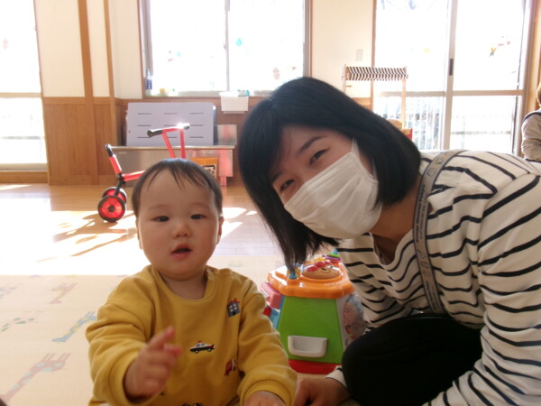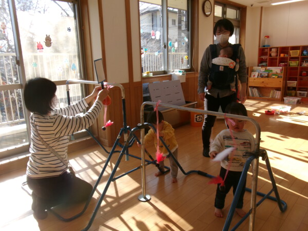 今年初めての園舎開放がありました。親子で元気に参加してくれて多目的ホールが一瞬で明るくなりました。手作りの羽子板で羽根つきをしました。なかなか上手にできないけれど何度か挑戦しましょうね。手型もとりました。成長の記録として残したいと思います。絵本や、お話にもママたちが参加してくれるのでとっても微笑ましい時間がすごせています。今年もよろしくお願いいたします。