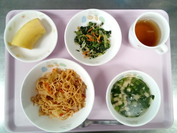 焼きそば、ナムル、きつねスープ、バナナ