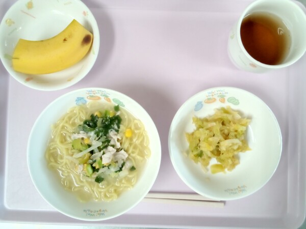 味噌ラーメン、キャベツのごま和え、バナナ