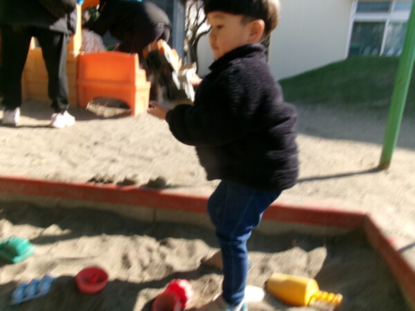 日中は太陽が顔を出しお砂場遊びや、ブービーカーに乗って自由遊びを楽しみました。