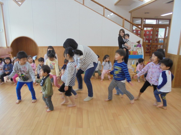今日は地域のお友だちのリズム遊びの日です。朝から雨が降っていましたが、今日もたくさんの地域のお友だちに遊びにいらしていただきました!年長組と手を繋いで”とんぼ””汽車””きのこ”などのリズム遊びをしましたよ。ピアノに合わ … “リズム遊び♪” の続きを読む