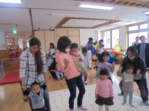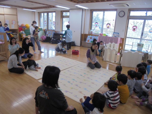 今日は親子体操です。雨が降ったり止んだりのお天気でしたが、たくさんのお友だちが参加してくれましたよ!お母さんと一緒に輪になって身体を動かしたり、向かい合いボールを転がしてキャッチしたりと全身を使って楽しんでいました!最後 … “☆親子体操☆” の続きを読む