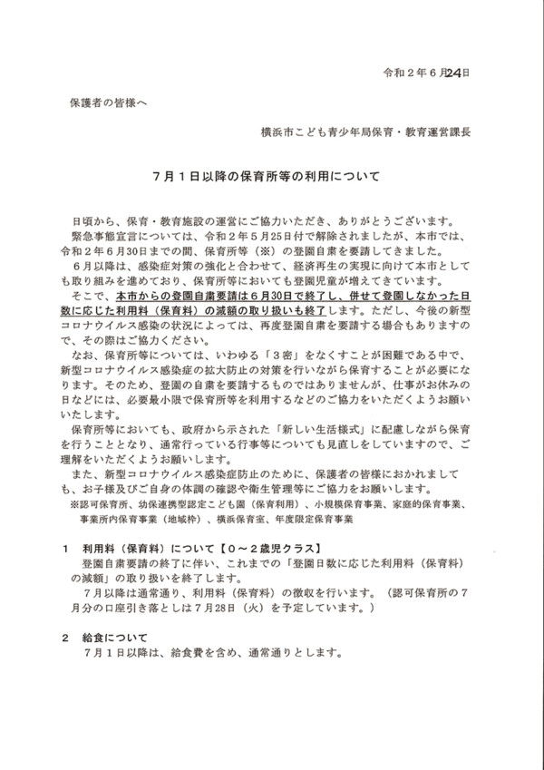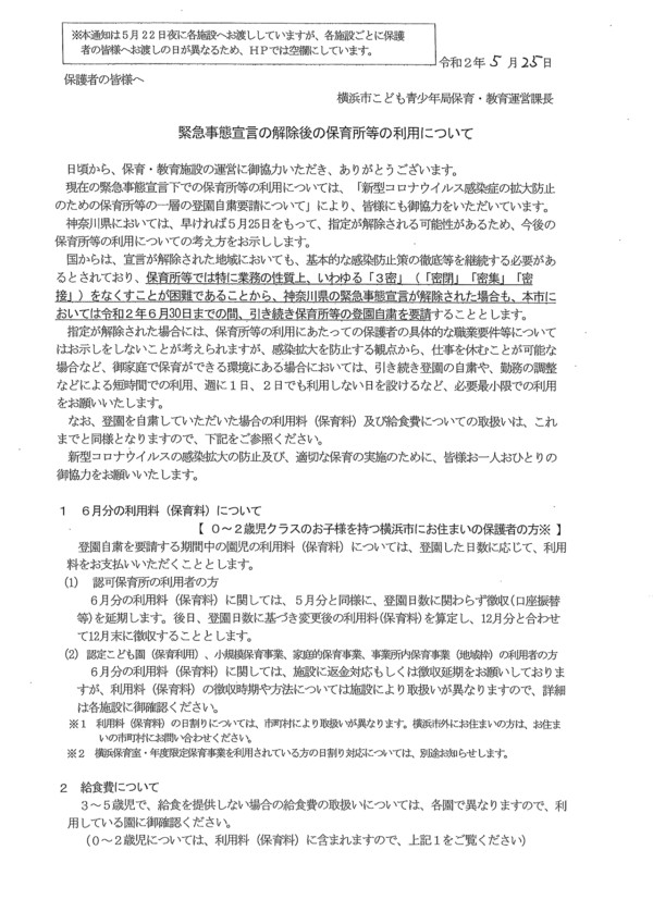 (全園児)来週より掛け布団は使用しませんので、バスタオルの用意をお願いします。掛け布団がバーは不要です。 (3~5歳児)暑くなり午睡でも汗を多くかくようになりました。そのため、6/8(月)より当分の間パジャマの使用はせず … “お知らせ” の続きを読む
