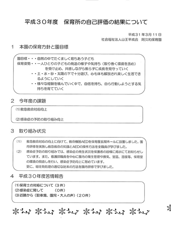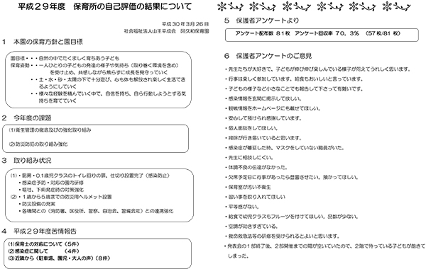 阿久和保育園の自己評価について結果を公開いたします。PDFファイルにてご覧ください。