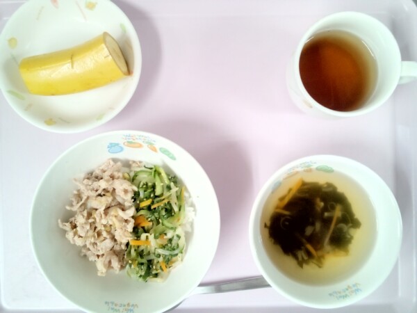 ビビンバ丼、わかめスープ、バナナ わかめ特有のぬめりは食物繊維のアルギン酸によるものです。カルシウムやカリウムなどのミネラルもたっぷりで骨を丈夫にしたり、高血圧の予防につながる頼もしい食材です。