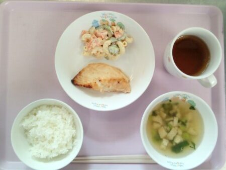 ごはん、魚の香味焼き、マカロニサラダ、きつねスープ にんにくの強い香り成分は硫化アリルによるものです。硫化アリルは強い抗菌作用や抗酸化作用を持ち、免疫力増強、動脈硬化予防にはたらきます。