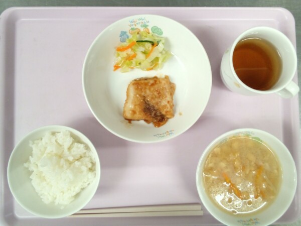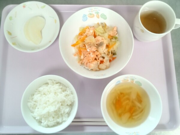 ごはん、魚のちゃんちゃん焼き、スープ、梨 ジューシーでさわやかな甘味が特徴の梨は、約90%が水分です。甘味はソルビトールという糖アルコールの一種によるもので、便通の改善やのどの炎症をしずめるはたらきがあります。