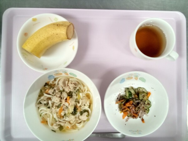 肉うどん、もやしのゆかり和え、バナナ もやしはビタミンCを含むため、かぜ予防が期待できます。体内でコラーゲンを形成するはたらきもあり、美肌づくりに役立ちます。そのほか、微量ながらカルシウムやカリウム、鉄も含んでいます。