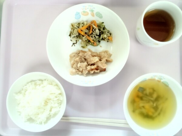ごはん、めかじきの揚げ煮、キャベツ和え、味噌汁 味噌汁にもやしを使用しています。もやしはビタミンCを含むため、かぜ予防が期待できます。体内でコラーゲンを形成するはたらきもあり、美肌づくりに役立ちます。