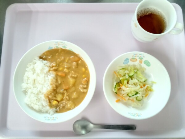 ごはん、コーンカレー、キャベツの甘酢漬 きゅうりは約95%以上の水分と豊富なカリウムが、利尿に役立ちます。カリウムには体内の余分な塩分(ナトリウム)の排泄を促す効果もあり、高血圧予防にもはたらきます。
