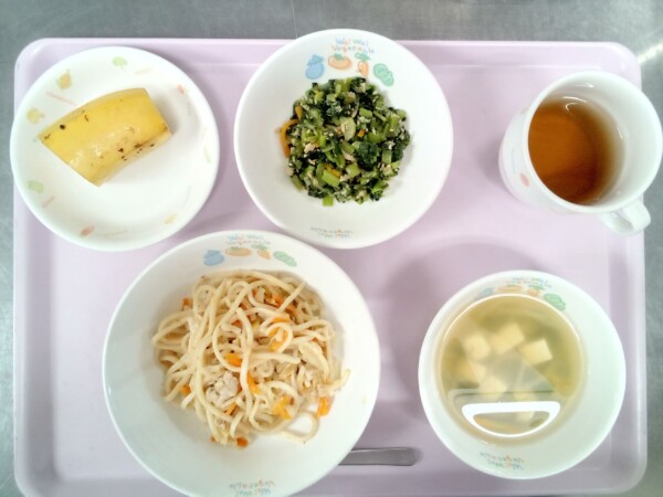 焼きうどん、小松菜とツナのごま酢和え、豆腐と野菜のスープ、バナナ だいずが原料の豆腐は、だいずの持つ栄養素を手軽に摂れる食材です。たんぱく質は肉に匹敵するほど良質で、必須アミノ酸であるリジン、フェニルアラニン、トリプトフ … “焼きうどん” の続きを読む