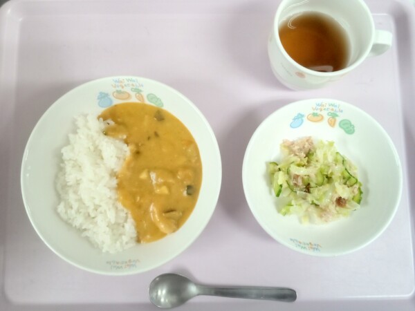 ごはん、夏野菜カレー、グリーンサラダ 今日の夏野菜カレーにはかぼちゃを使用しています。かぼちゃのオレンジ色はβカロテンの色で、粘膜や皮膚を丈夫にするため、かぜの予防や美肌づくりに効果が期待できます。またβカロテンには抗酸 … “夏野菜カレー” の続きを読む