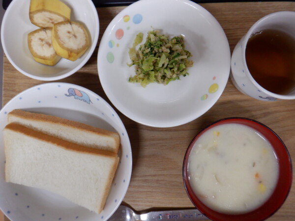 今日の給食は、 食パン クリームシチュー ブロッコリーサラダ フルーツ(バナナ) です。 離乳食は、 全粥 うわずみ(玉ねぎ) 鶏肉と根菜の炒り煮(鶏肉、かぼちゃ、人参、じゃが芋) ブロッコリーサラダ(ブロッコリー、キャ … “クリームシチュー” の続きを読む