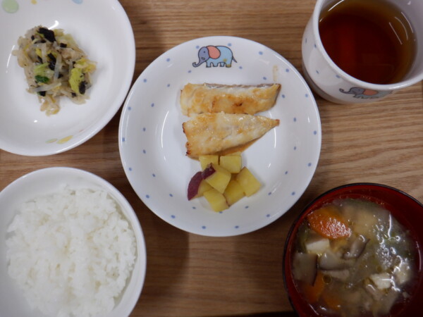 今日の給食は、 ごはん 赤魚の西京焼き 白菜の海苔和え けんちん汁 です。 離乳食は、 全粥 うわずみ(人参、大根) 鮭の煮付け(鮭、さつまいも) 白菜のお浸し(白菜、ほうれん草) です。